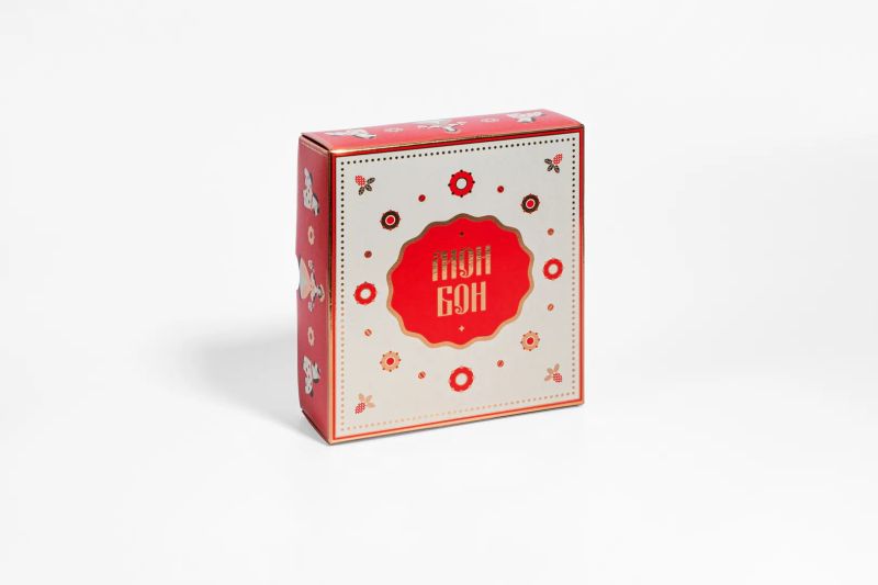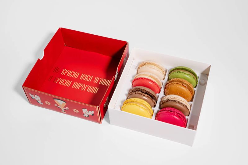 Коробка оформлена в новогодней палитре с элементами дымковской росписи и золотыми акцентами. А внутри — послание: «Не красна изба углами, а красна пирогами».