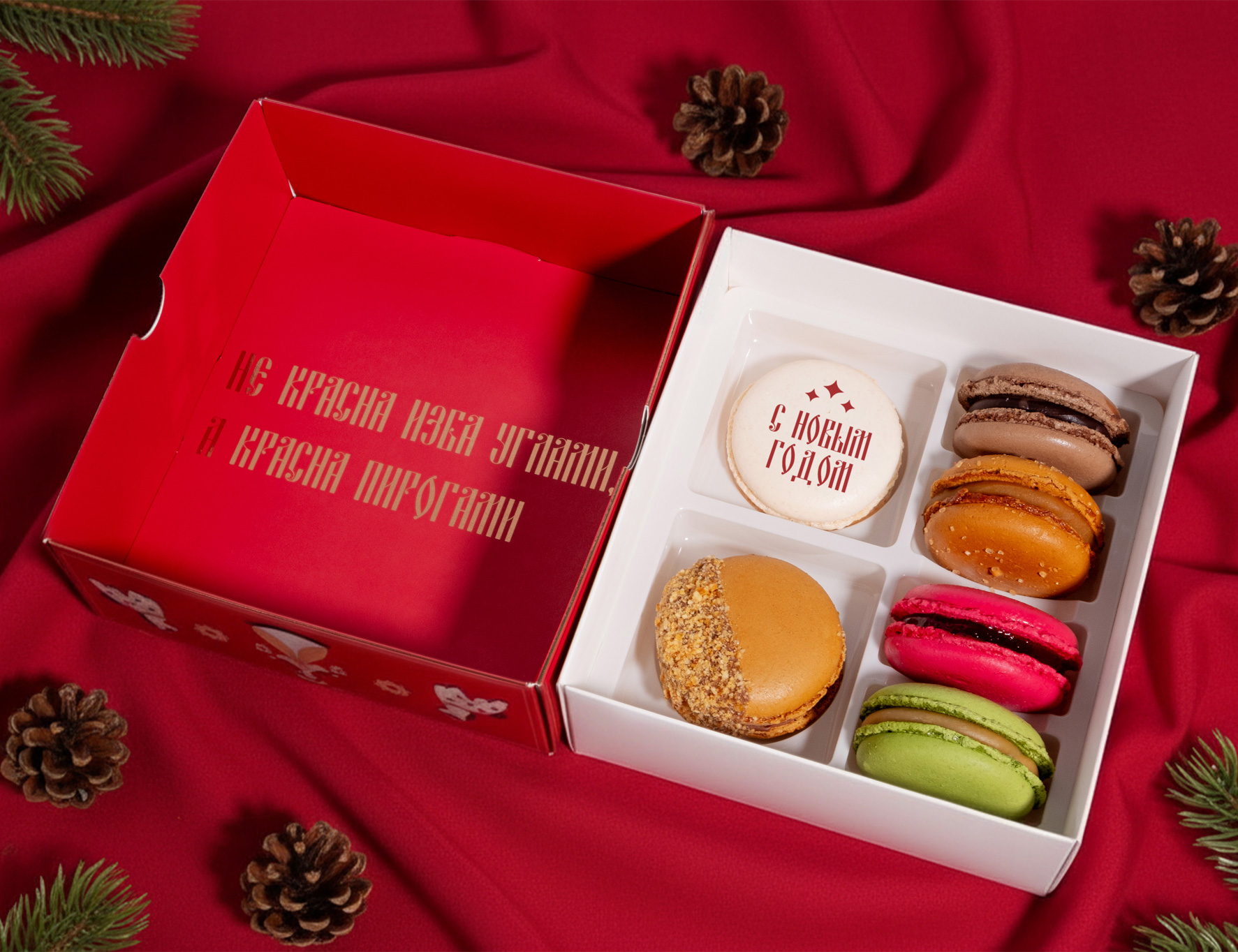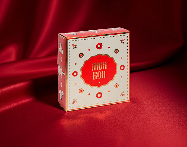 Коробка настоящая звезда: с золотыми акцентами и изысканным принтом в духе дымковской росписи. А внутри — послание, словно из бабушкиной сказки: «Не красна изба углами, а красна пирогами».