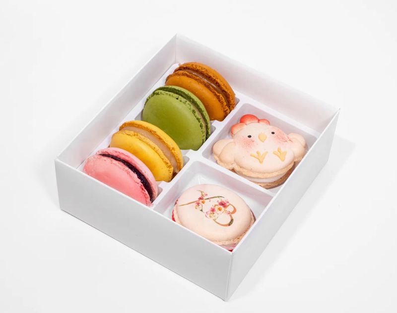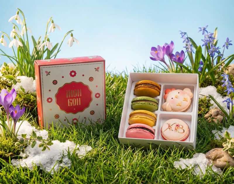 Идеальный вариант для небольшого, но тёплого подарка. Внутри нежные классические макароны и милые фигурные макароны в виде цыплёнка и зайки, который сразу создаёт пасхальное настроение.