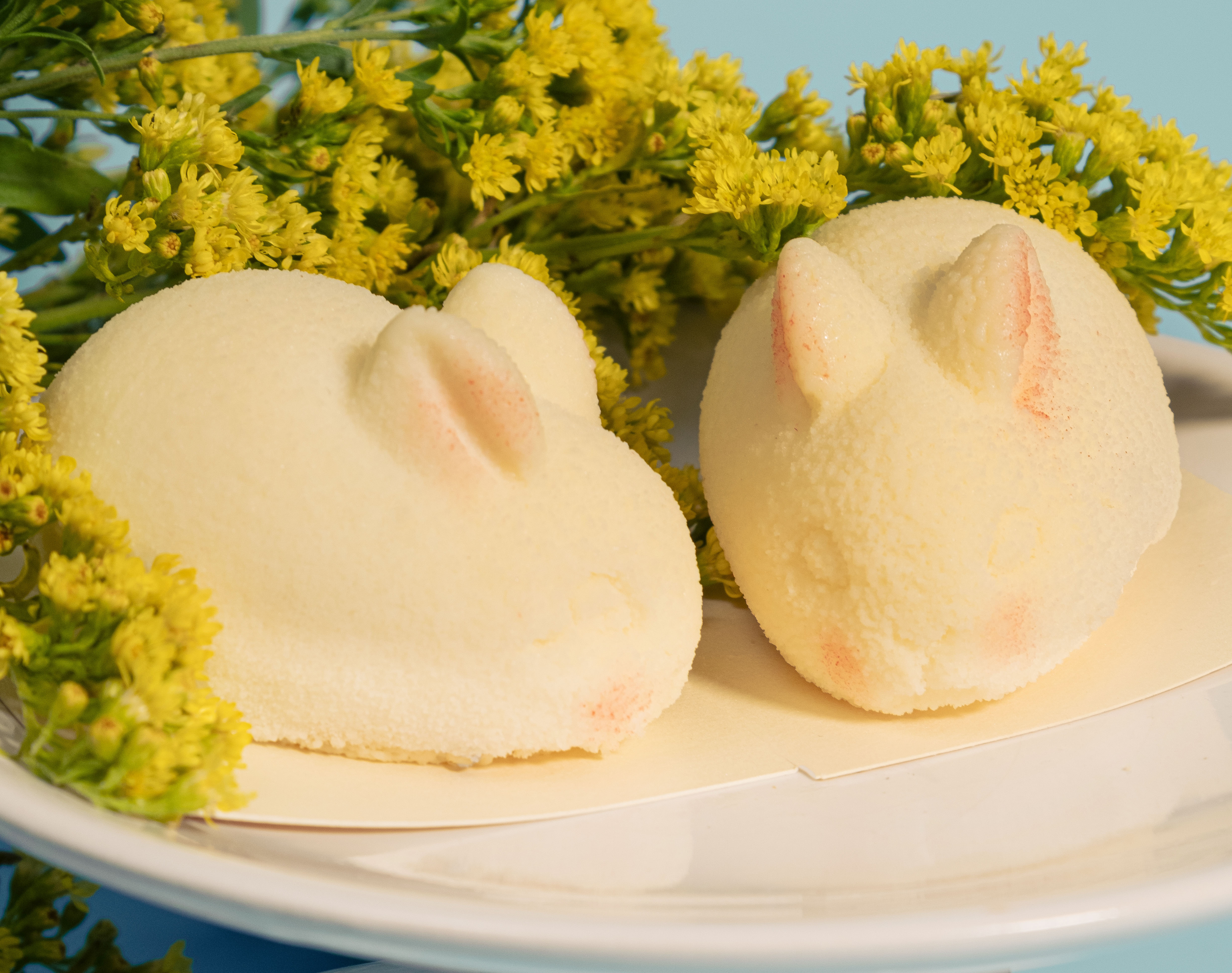 Это десерт с сюрпризом: снаружи кролик, внутри яичко — кокосовый мусс с сердцевинкой из мусса манго-маракуйя с семенами чиа. Покрыт кролик велюром из белого шоколада.