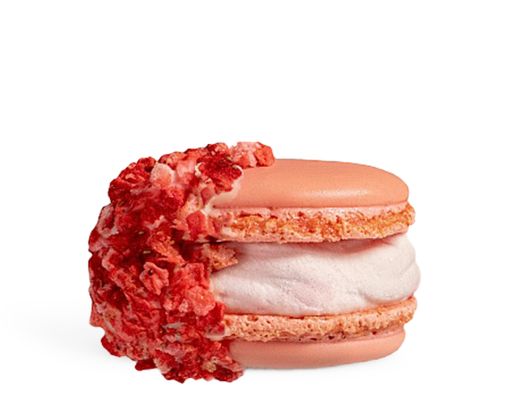 Сочетание взбитых сливок со сливочным маскарпоне, сладкий клубничный конфитюр, а также сублимированная клубника.