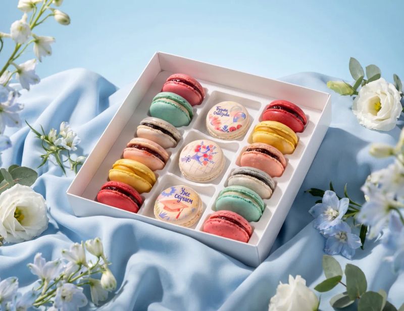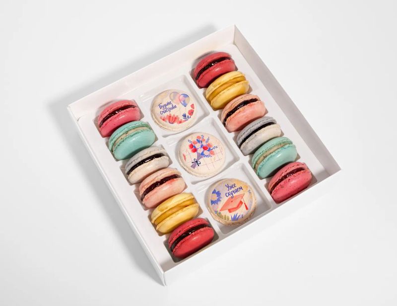 Набор с макаронами с акцентными надписями и праздничными элементами. Более яркий и заметный, сразу создаёт ощущение события и внимания. Когда хочется поздравить, порадовать и сделать это красиво.