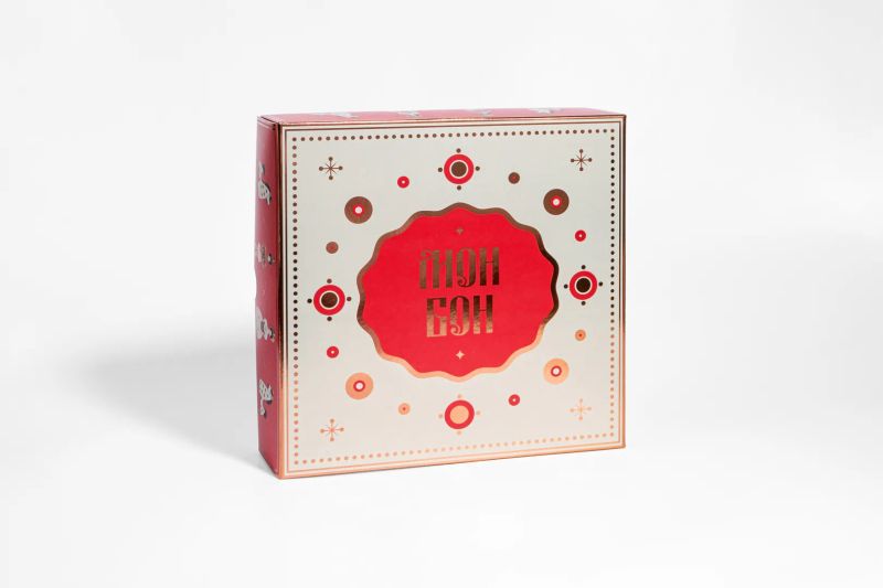 Коробка украшена праздничным узором в духе дымковской росписи с золотым тиснением, как настоящая подарочная шкатулка.