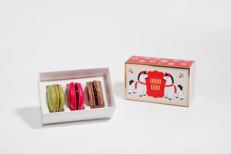 Внутри три пирожных макарона из классической линейки: сочный гранат, благородная фисташка и насыщенный шоколад. Яркие, как новогодние игрушки, и такие вкусные, что хочется брать сразу несколько!