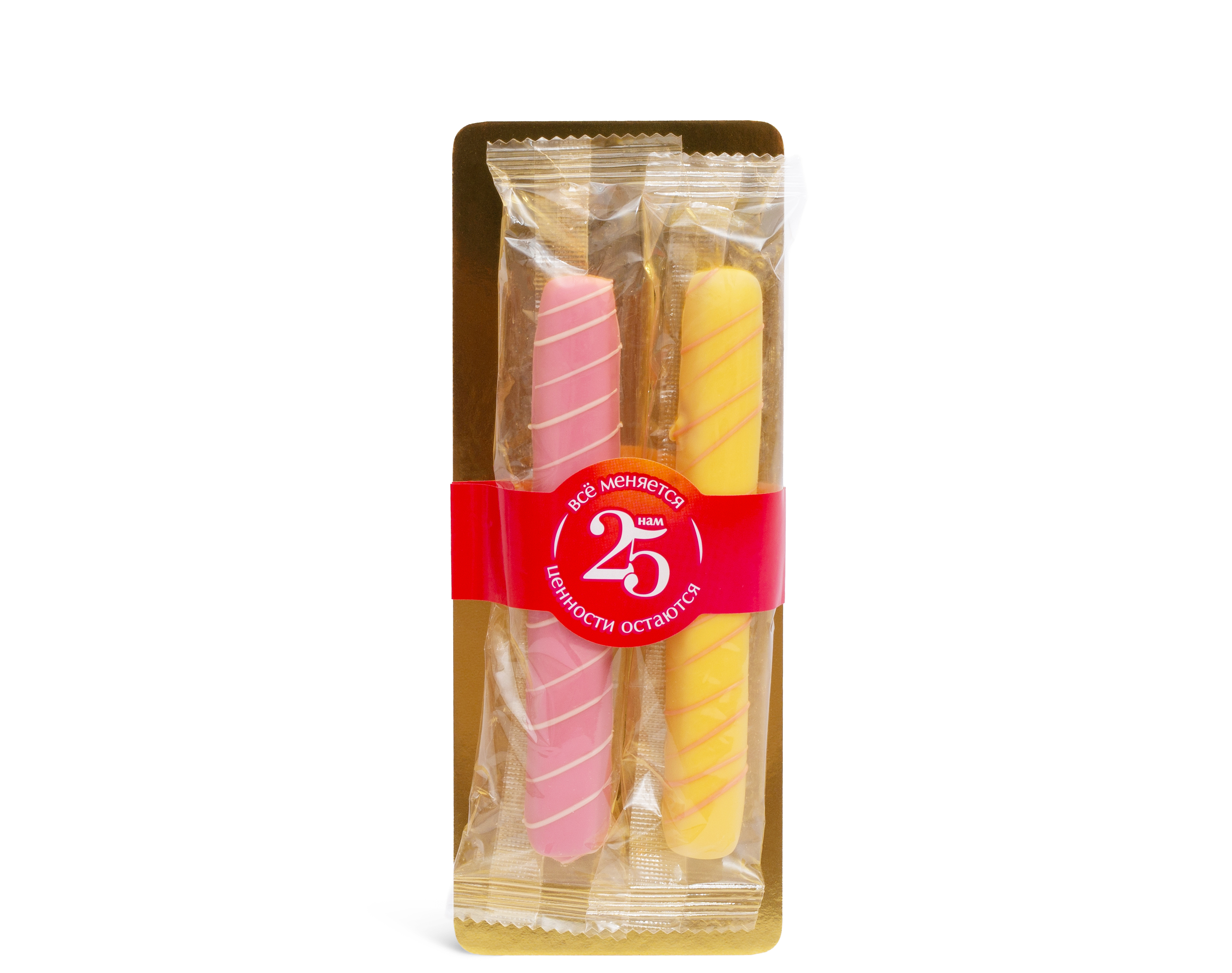 «Праздничный дуэт» — это изысканное сочетание рассыпчатого теста и летних ягодно-фруктовых вкусов. В набор входят два вида угощений: печенье в белом шоколаде со вкусом сочной клубники и эксклюзивное печенье в банановом шоколаде, созданное специально к юбилею компании.