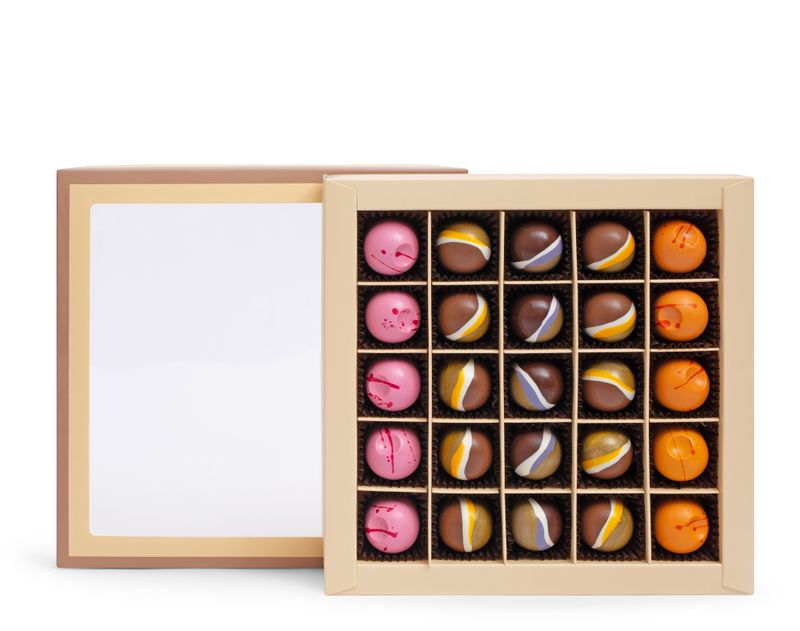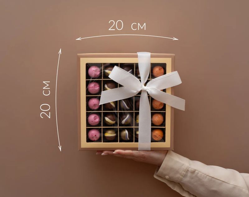 В набор входит пять видов корпусных конфет: "Соленая карамель", "Ягодный маффин", ассорти "Самоцветы".