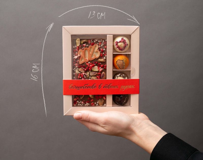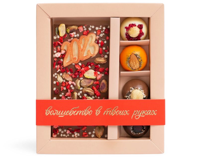 Аппетитный молочный шоколад с фисташкой, хрустящими шариками и клубникой в наборе с оригинальными конфетами. Прекрасный новогодний подарок себе и близким.
