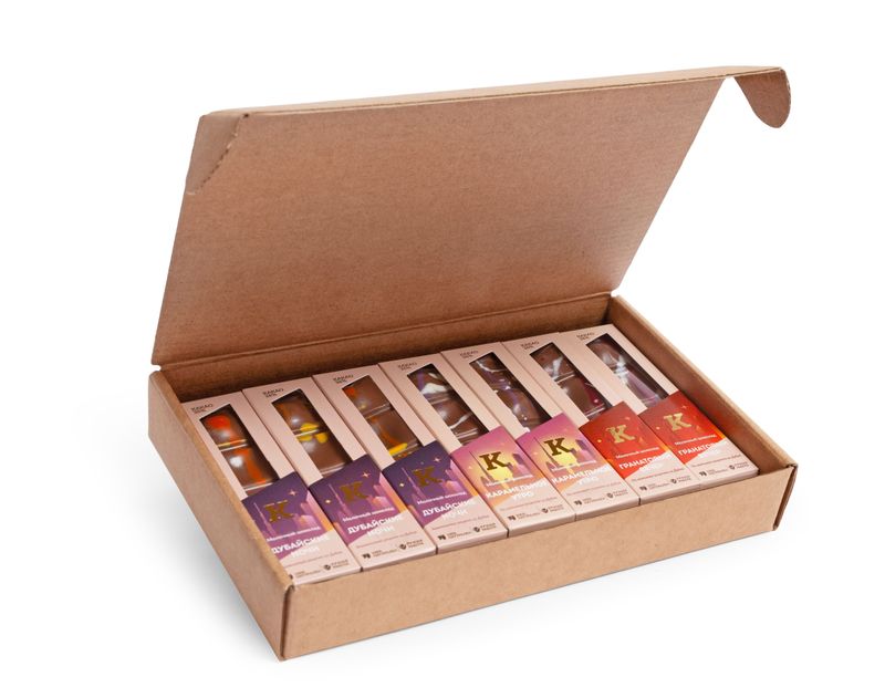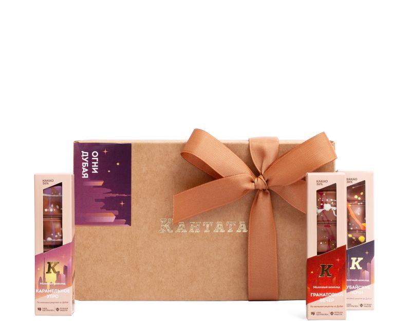 В этом наборе мы собрали три плитки шоколада «Дубайские ночи», две плитки «Гранатового вечера» и две плитки «Карамельного утра» – продолжение дубайских мотивов в плитке из молочного шоколада с хрустящей начинкой и оригинальным вкусом.
