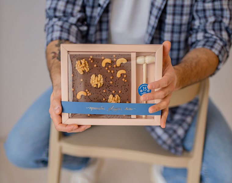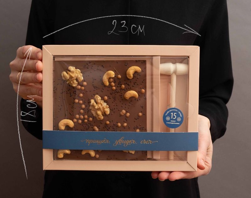 В составе набора большая плитка из молочного шоколада с простым и изящным узором из отборных грецких орехов и кешью. Праздничный хаос в рисунок привносят шоколадная крошка и хрустящие шарики соленой карамели. И не забудем про деревянный молоточек, от нескольких ударов которого плитка разобьётся на части. Важный момент! Чтобы плитка раскололась вдребезги, надо остудить её пыл в холодильнике 15 минут. В жаркой атмосфере шоколад начинает таять и его уже не разбить. Небольшой совет: старайтесь попасть молотком на саму плитку, а не на орехи или шарики, так шоколад расколется быстрее.