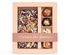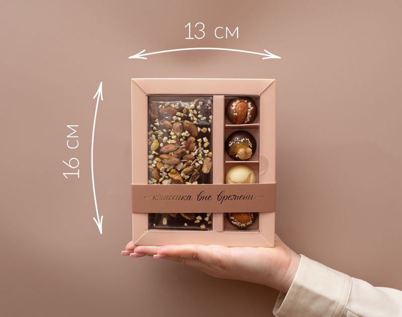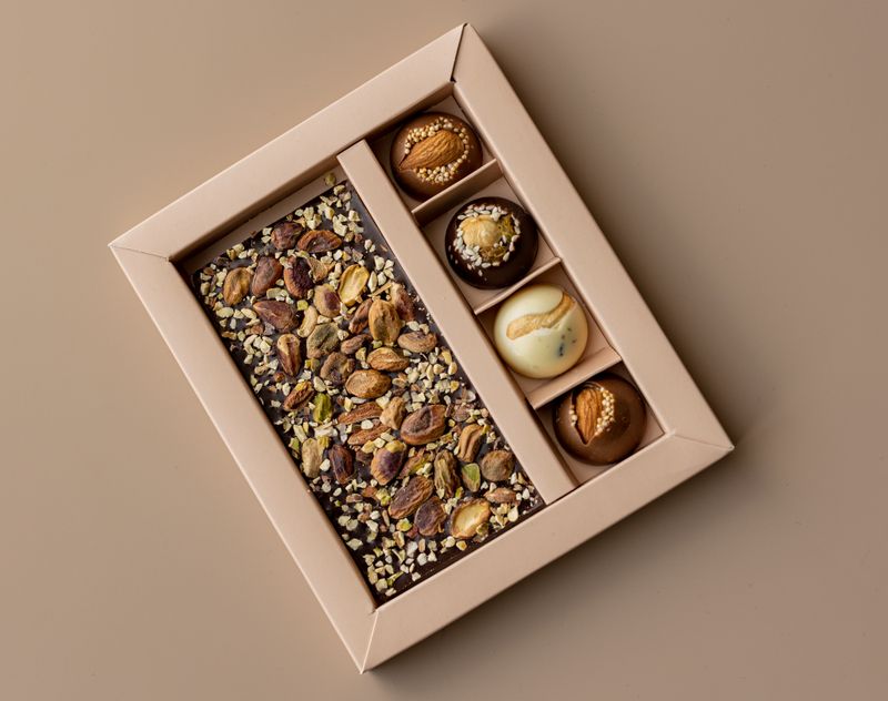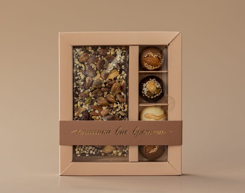 Тонкая плитка темного шоколада «Гималайские горы» с фисташкой и гималайской солью в этом наборе сладостей сочетается с четырьмя конфетами: