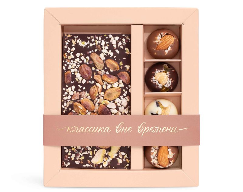 Удовольствие для настоящих гурманов. В наборе: тёмный шоколад с фисташкой и гималайской солью - изысканное сочетание вкусов и оригинальный дизайн.