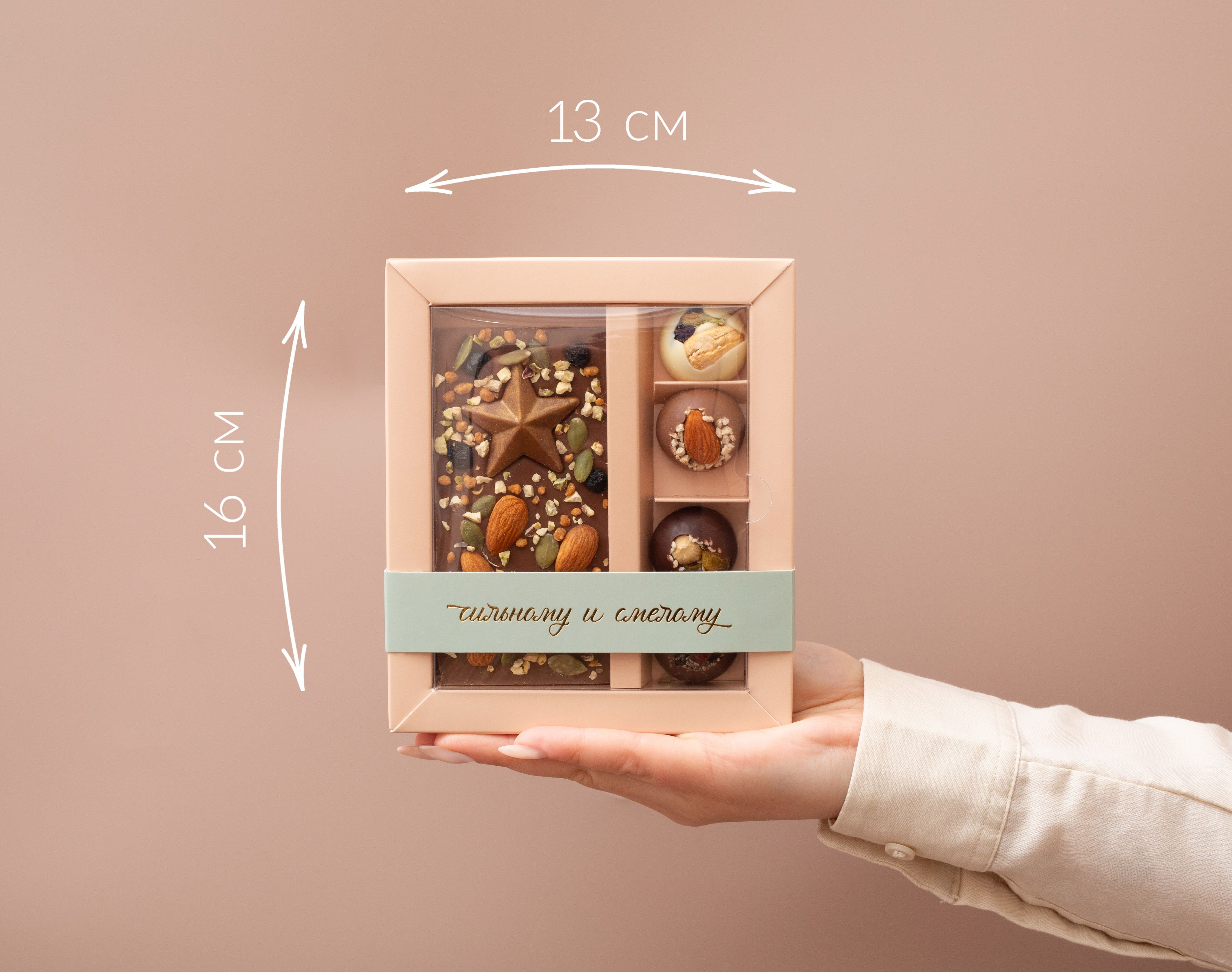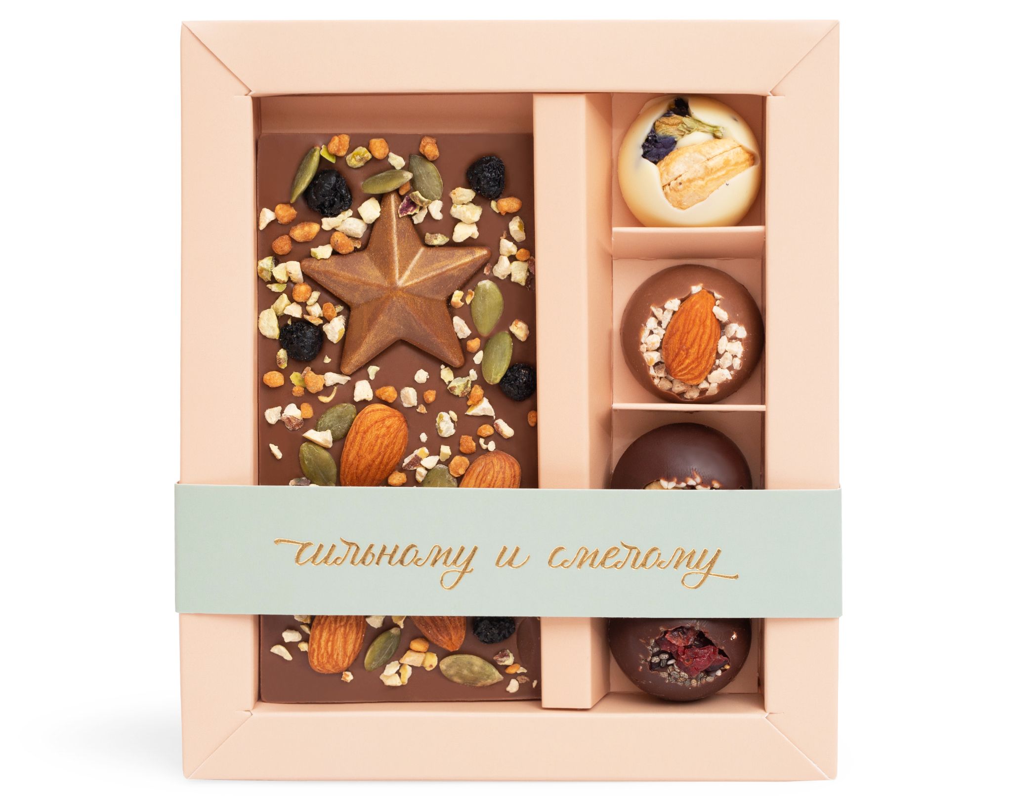 «Знак внимания» – это идеальное решение для тех, кто хочет порадовать любимого человека, товарища или коллегу вкусным и оригинальным подарком. Набор включает в себя шоколадную плитку и четыре уникальные конфеты, каждая из которых создана для того, чтобы оставить незабываемые впечатления.