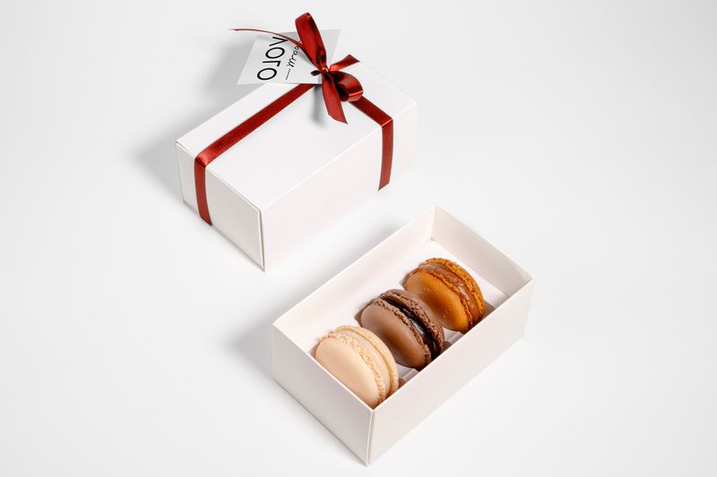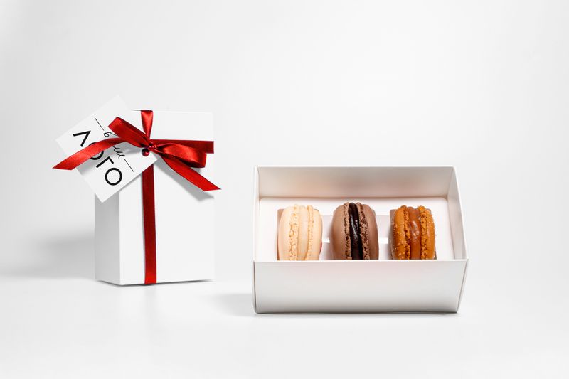 Ювелирный набор из 3 пирожных макарон, когда нужно много лаконичных, но значительных подарка. Цвет и вкус пирожных можно выбрать из палитры 21 вкуса Mon Bon.