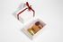 3 пирожных в упаковке из белого картона и бирка с вашим логотипом.