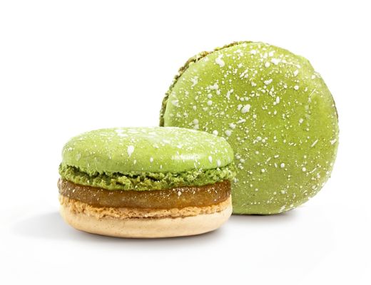 Насыщенный вкус крема из бескомпромиссно стопроцентной фисташковой пасты раскрывается, как нигде, именно в сочетании с хрупкими миндальными половинками макарона.