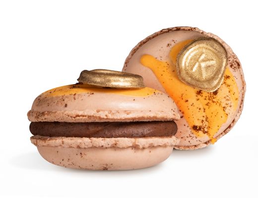 Внутри яркое апельсиновое конфи с лёгкой кислинкой. Снаружи нежный крем со вкусом настоящего эспрессо, с лёгкой горчинкой и бархатной текстурой. А сверху декор из тёмного шоколада покрытого золотом.