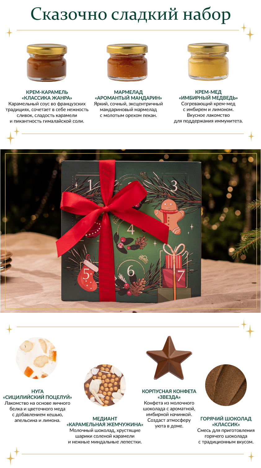 - Корпусная конфета «Звезда»: молочный шоколад с ореховой пастой и пряностями, создающий уютную атмосферу.
