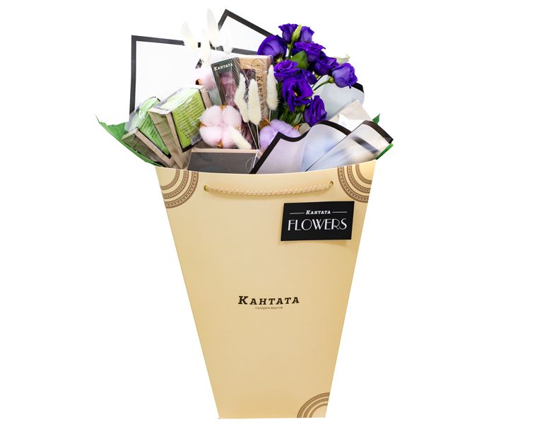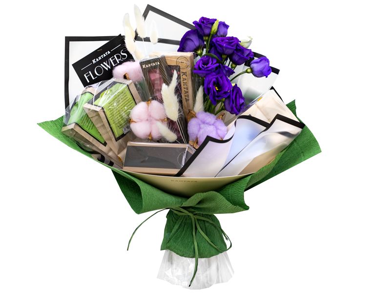 Акцент на главном. А что главное для девушки — конечно, цветы! Компоненты подарка связаны единым мотивом, везде прослеживается цветочная нота. Яркая лаванда, почти классический жасмин, желтая календула, так изящно распускающаяся в шарике связанного чая. Все это дополняется фруктами — персиком, инжиром, клубникой. И, конечно, помощник любой девушки — шоколад!