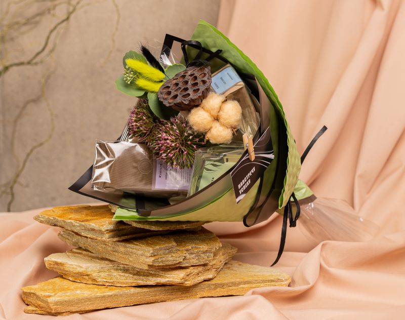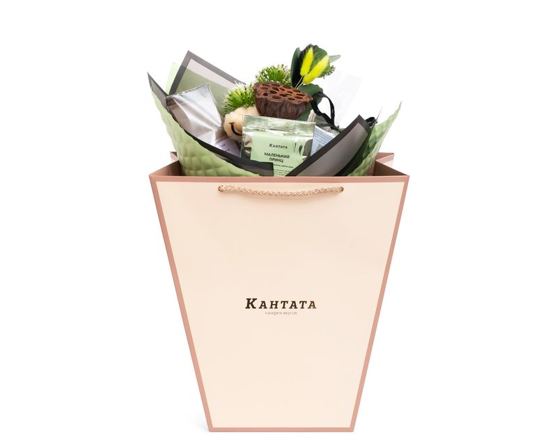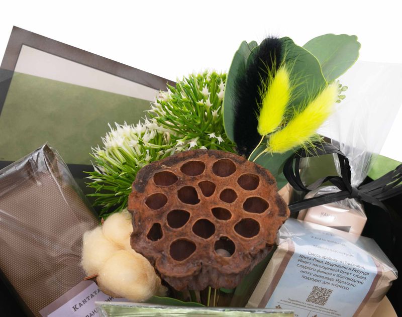 Впечатляющий букет, в котором собрана линейка напитков и сладостей – два душистых чайных купажа, два сорта кофе и аппетитный шоколад ручной работы.