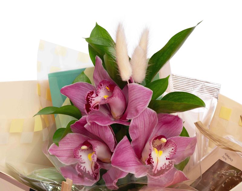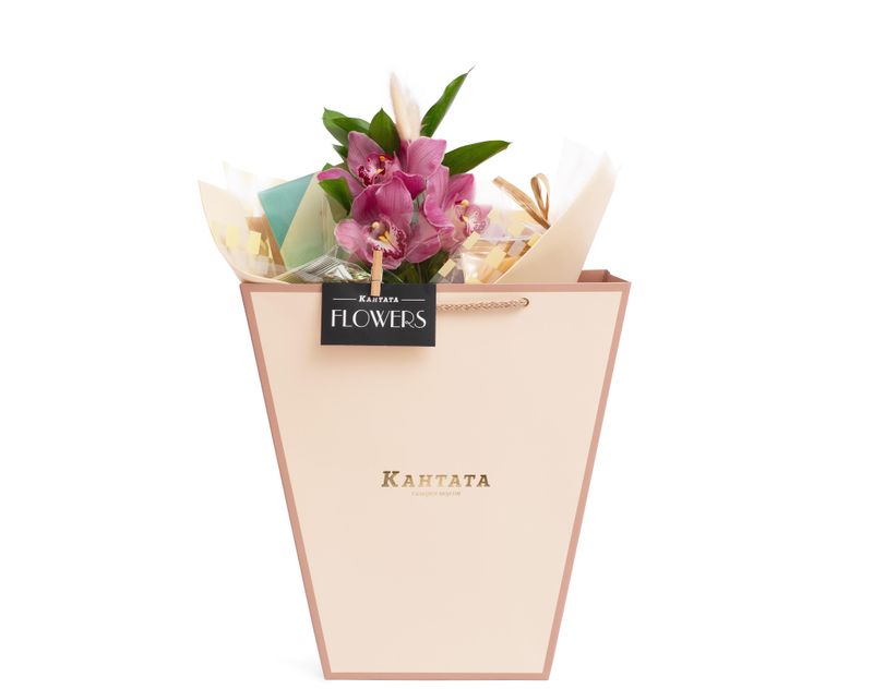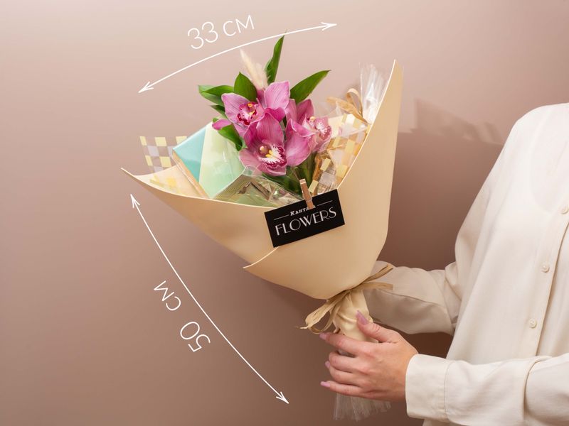 Эффектный букет, центром которого стала композиция из нежных живых орхидей и рускуса! В подарок мы вложили сразу пять сортов согревающего чая – как классического, так и десертных купажей. Плитка полезного шоколада с аронией, семенами тыквы и кунжута сделает чаепитие еще вкуснее и уютнее.