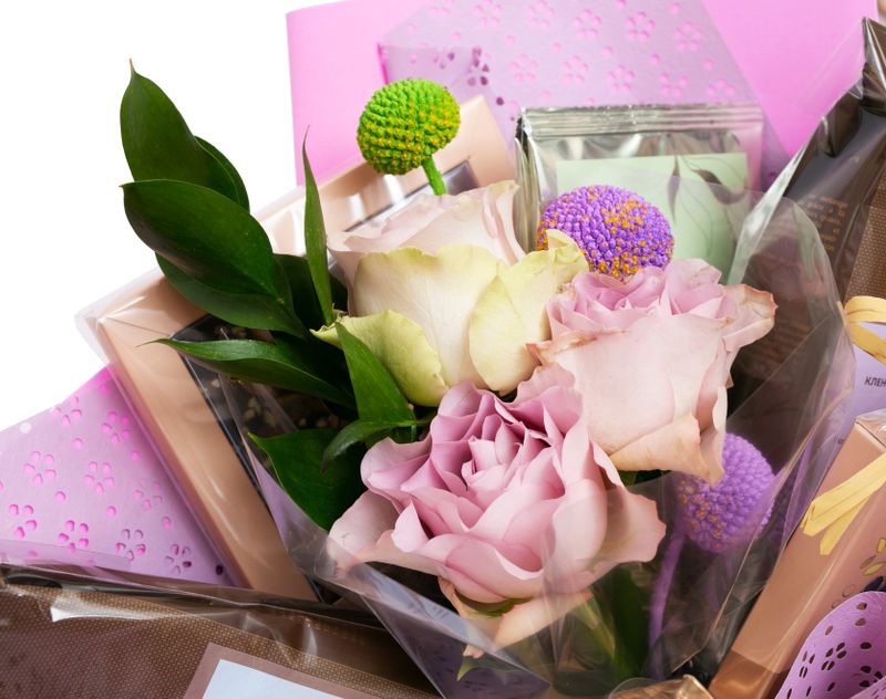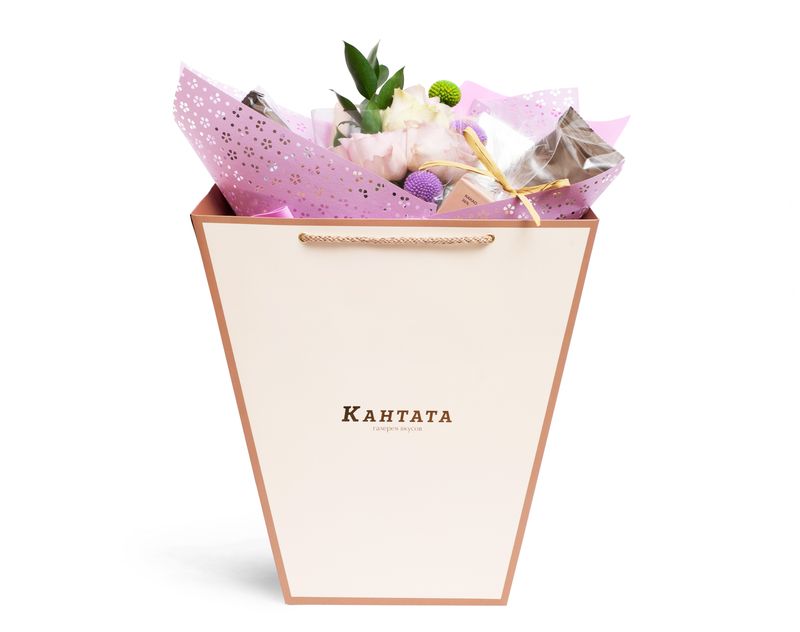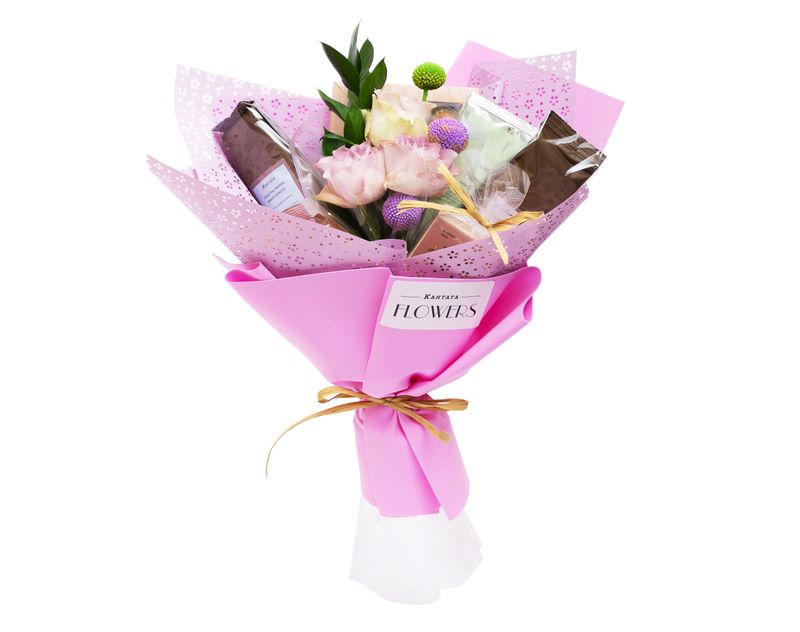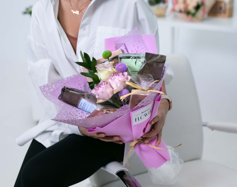 Изящный букет с ароматными живыми цветами, полный великолепных вкусов чайно-кофейного мира. В подарок мы вложили купаж черного чая с кусочками фруктов «Клюква с персиком», зеленый чай с аппетитным звучанием «Все девушки любят малину» и купаж зеленого чая с черникой «Гармония». Добавили и кофе — согревающий «Кленовый сироп» и классический «Гондурас Финка Монте Кристо» с оттенком ржаного хлеба. На десерт — вкусный шоколад «Красота» с полезными для здоровья ингредиентами, а также набор тёмного шоколада с фисташкой и пикантной гималайской солью, который никого не оставит равнодушным!