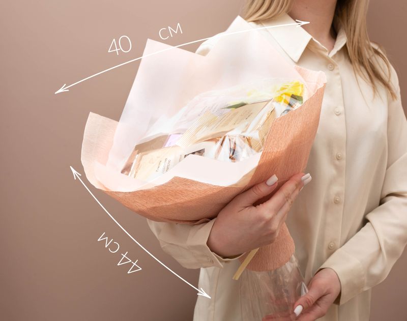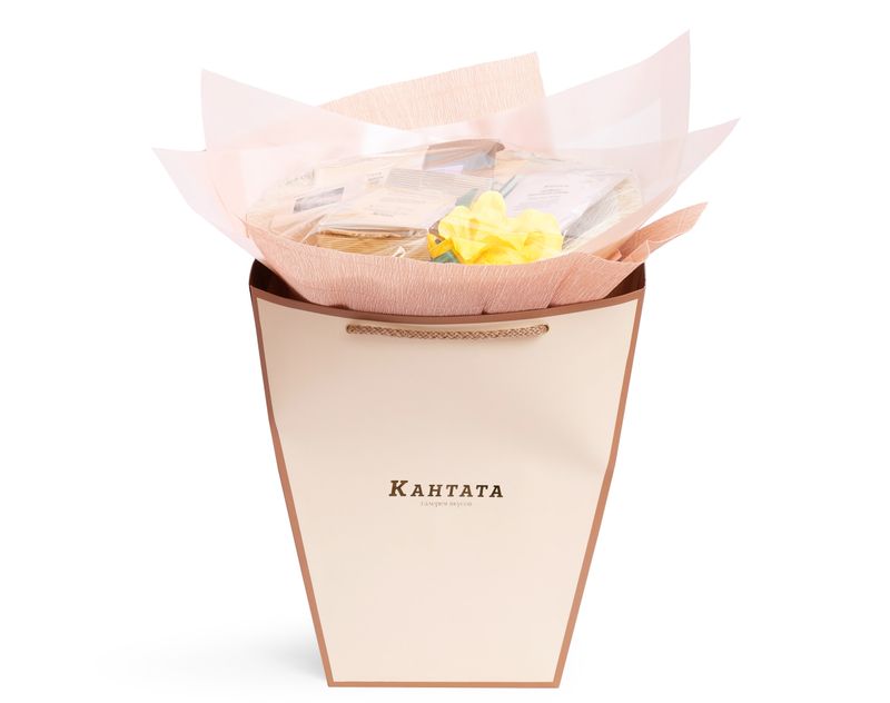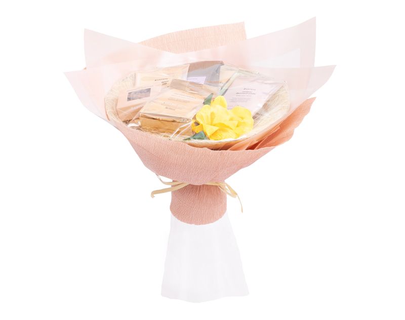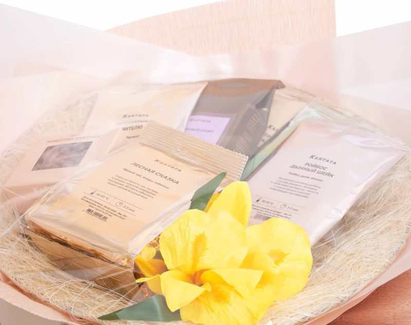 Нежный букет, который покорит не только своим стильным видом, но и очень вкусным наполнением! В подарке собраны шесть ароматных напитков — купаж черного чая с говорящим названием «Любимому учителю», согревающий «Цитрусовый базилик», душистая «Лесная сказка», бодрящий «Имбирный лимонад» и сочный ройбос «Дынный шейк», а также десертный сорт кофе «Банановый Сплит» с уютным звучанием известного лакомства. На десерт — вкусные драже «Мишкин завтрак» с кедровыми орешками под слоем шоколада.