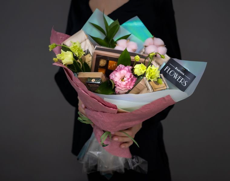 Букет, собранный с любовью. Такой подарок приятно дарить близким людям: маме, сестренке или самой близкой подруге. Внутри собраны самые разные вкусы: бисквитные, карамельные, ягодные и сливочные тона, вкус дыни и шоколада. Наслаждаться можно целый день!