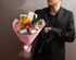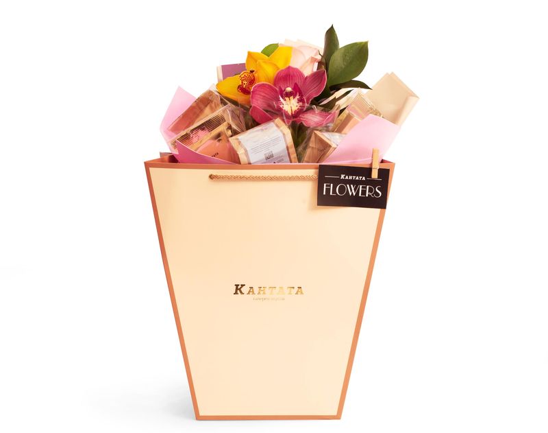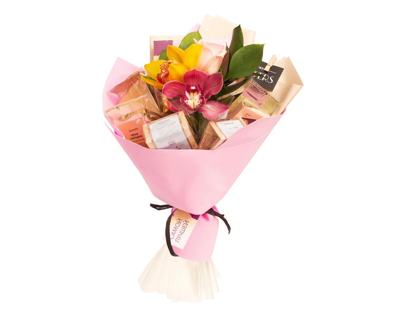 Изящный букет, в котором найдутся живые цветы с дивным ароматом, чай, кофе и десерты. В подарке дорогой сердцу человек обнаружит легендарный чай с бергамотом «Королевский Эрл Грей», по-весеннему душистый купаж «Черная смородина» и очаровательный «Ванильный бисквит» с основной из зеленого чая. В букете найдутся и кофейные сорта – классические «Эспрессо Масалто» и «Хаус Бленд», десертный «Лесной орех», а также сорт под названием «Капучино». Дополняет подарок тающая во рту плитка шоколада на меду.