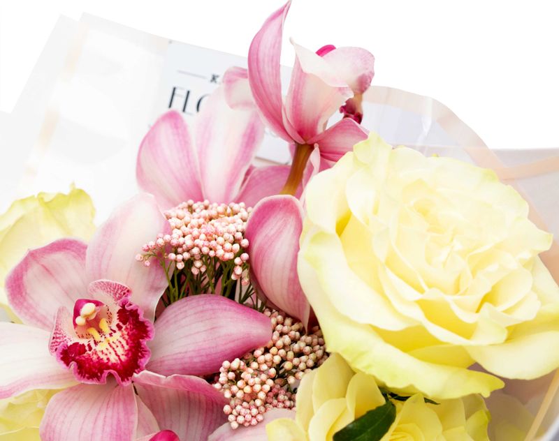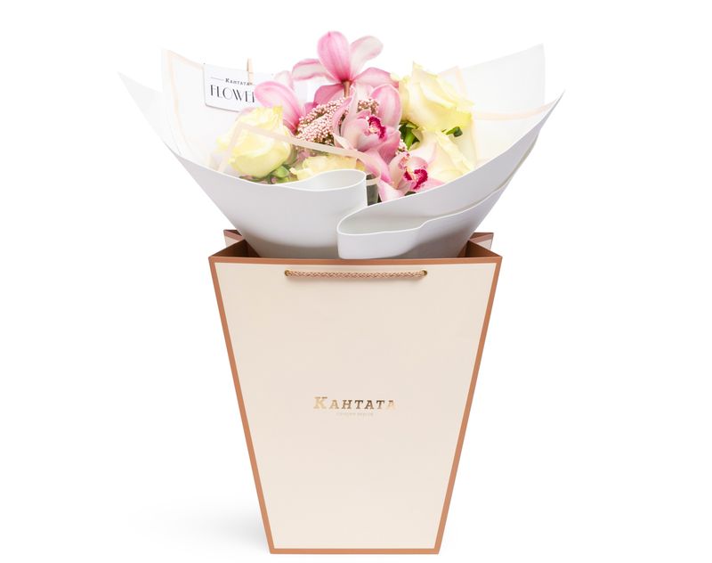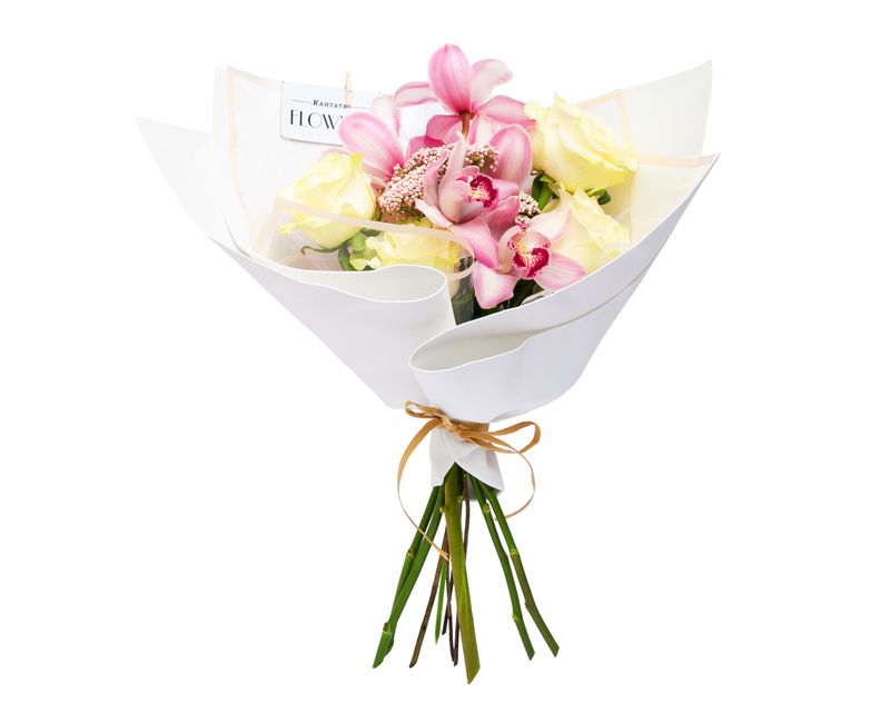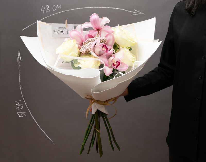 Чудесный букет, собранный из живых ароматных роз, орхидей и озотамнусов.