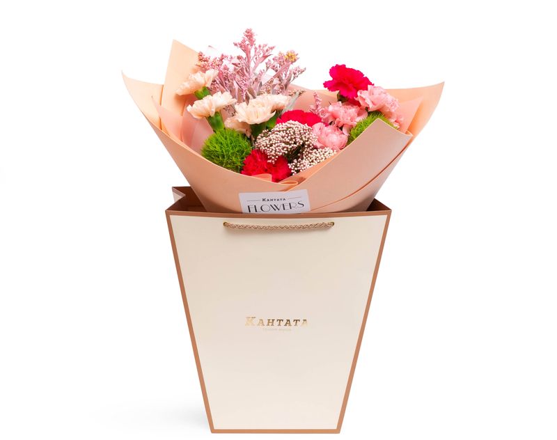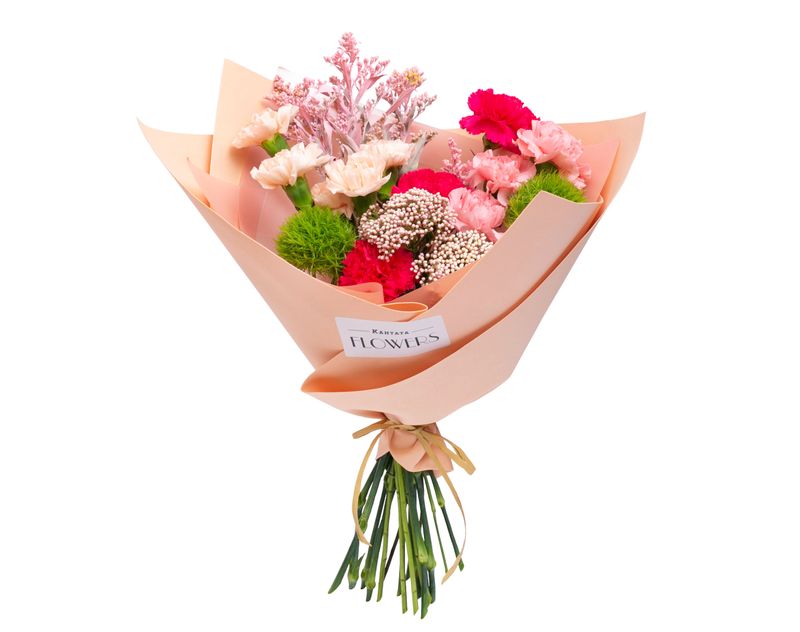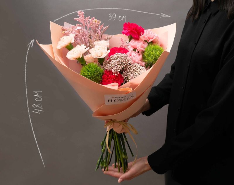 Приоткройте завесу волшебства вместе с этим изящным букетом, в котором мы собрали композицию из живых диантусов и озотамнусов, задорного солидаго и гвоздик.