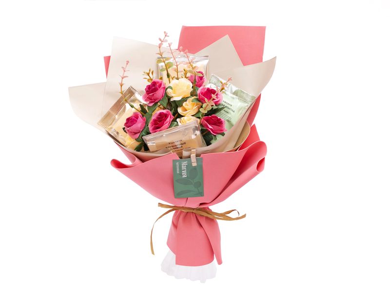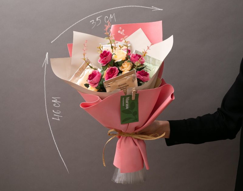 Нежный букет для ценителя чая. В подарок мы вложили купаж зеленого чая «Восход» с ягодами и классический «Зеленая улитка», купажи черного чая «Соусеп», «Клубничные сливки» и «Черная смородина»* с приятным сладким ароматом.
