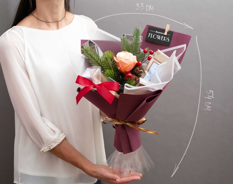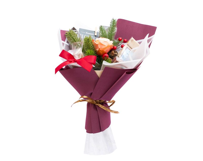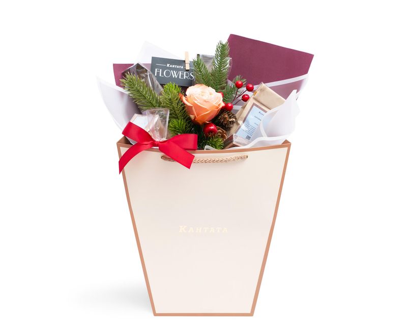 Ароматные живые розы и душистый лапник вместе с напитками и десертами создают ощущение близкого торжества. В этом изящном букете – четыре запоминающихся кофейных сорта: «Изумрудное кафе» вдохновит пряными нотами, «Ореховый брауни» окружит уютом, «Эфиопия Сидамо» покорит нотой молочного шоколада, а «Katusha blend» удивит богатством вкуса и аромата. К кофе мы добавили два десерта – это набор марципанов в шоколаде «Миндальное трио» и плитка шоколада «Под счастливой звездой», которые прекрасно дополнят напитки и умножат впечатление от радостного торжества.