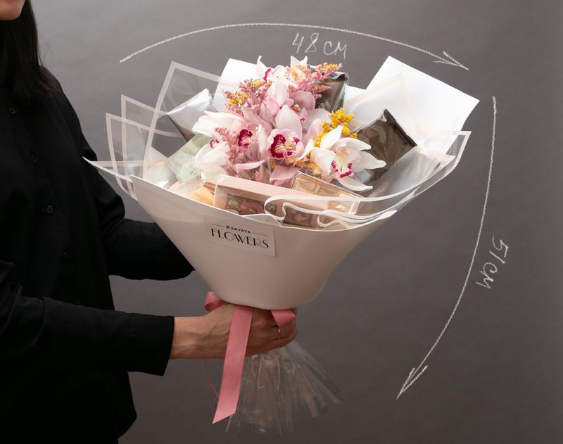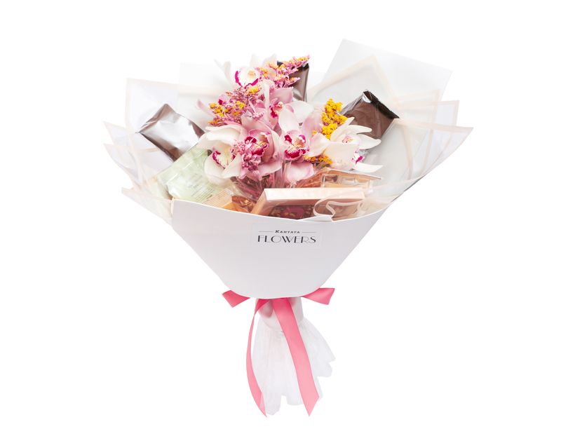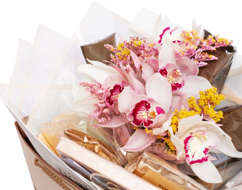 Превосходный подарок для истинного ценителя чая и кофе. Набор украшает композиция из живых цветов, а внутри мы собрали коллекцию из шести напитков, среди которой каждый сможет найти себе вкус по настроению. Дополнением к согревающим напиткам станет набор десертов из молочного шоколада с фундуком и ягодами «Классика».