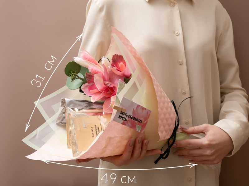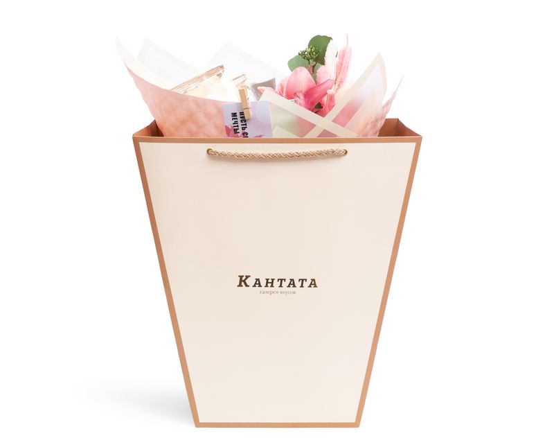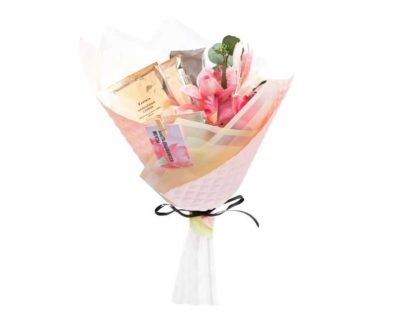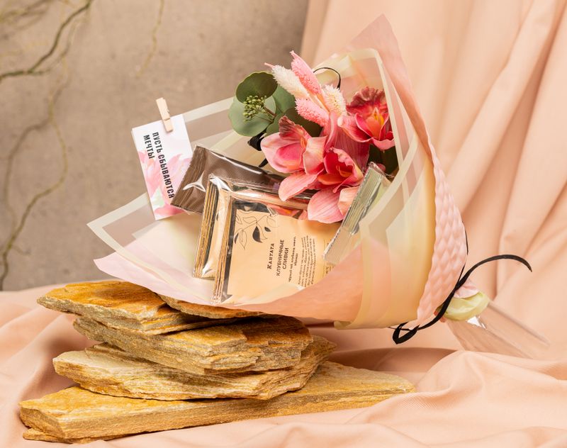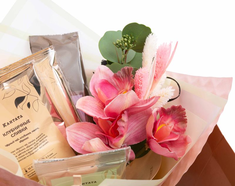 Изящный букет, внутри которого собрана ароматная коллекция согревающих напитков — черный чай «Клубничные сливки» с нежным ягодным звучанием, купаж зеленого чая «Маленький принц» с воздушным сладким ароматом и черный чай «Английская карамель», который подарит настроение на целый день. Также в букет мы поместили десертный кофе «Шоколад Вишня» в зернах, а к напиткам — плитку авторского шоколада с аппетитным вкусом смородины и мяты, который выгодно подчеркнет вкусы любимых сортов.