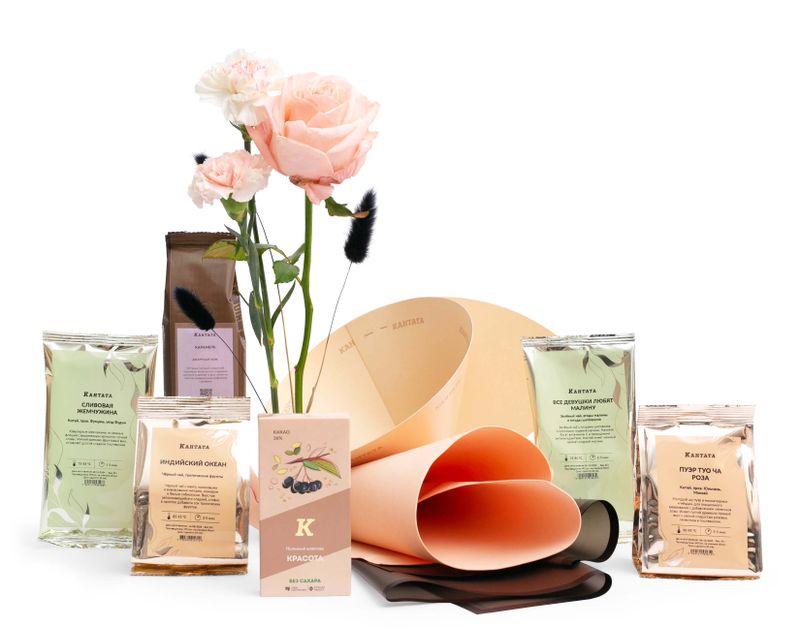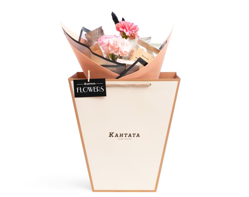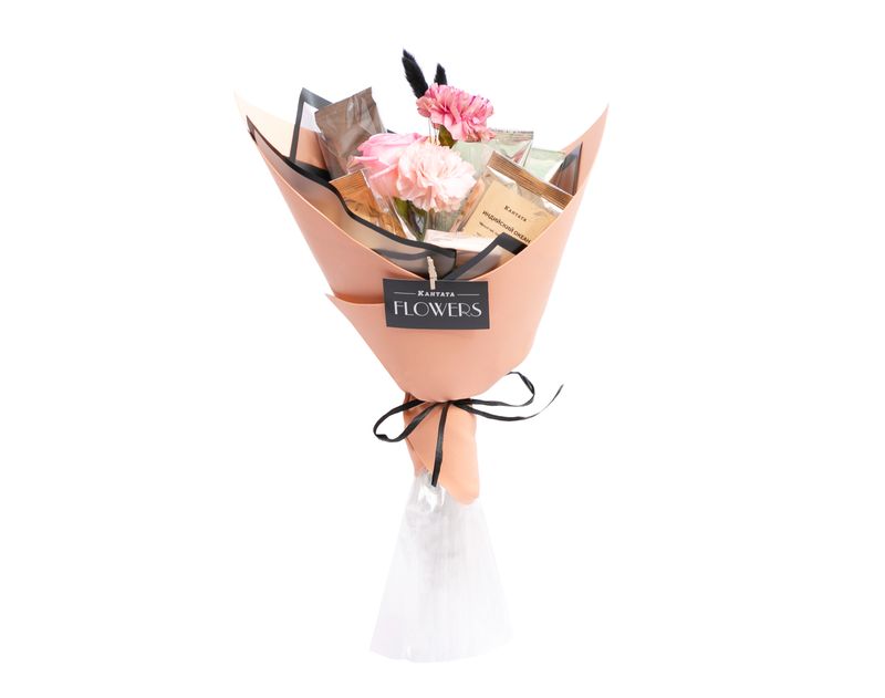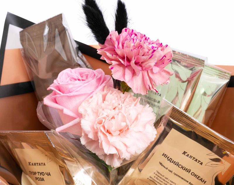 Эффектный букет, который точно очарует нежностью бутонов и вкусом наполнения! В подарок мы вложили четыре сорта чая, черного и зеленого, а также кофе в зернах с аппетитным карамельным ароматом. Плитка полезного шоколада «Красота» станет отличным дополнением напитков.