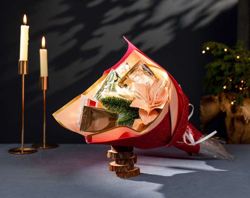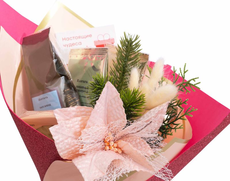 Изящный букет на долгожданный праздник! В нем мы собрали четыре ароматных напитка — три уютных сорта чая и бленд арабики в зернах. Шоколад ручной работы «Первый снег» с аппетитной снежинкой дополнит зимний вечер нотой тепла и уюта!
