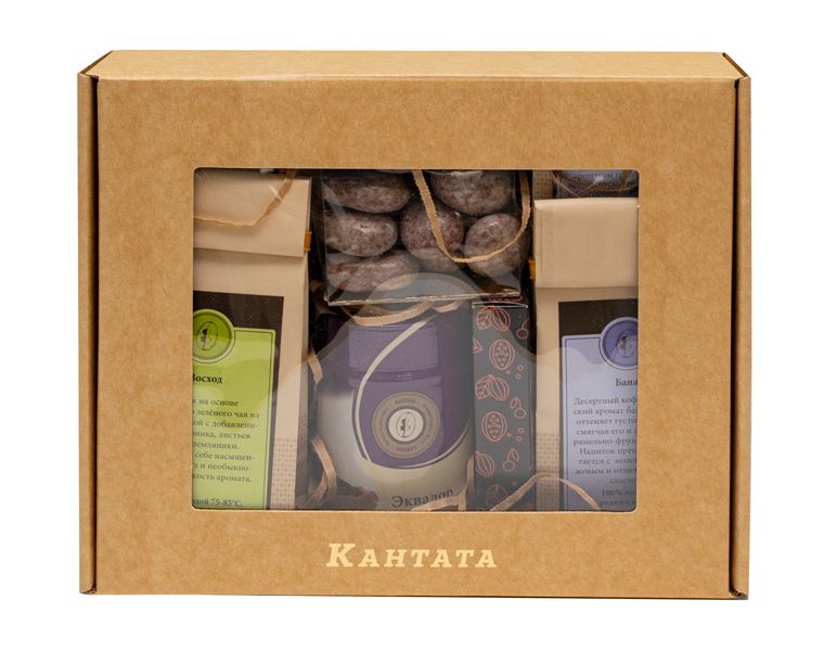 Ассорти орешков и фруктов в шоколаде, шоколадка с двойной начинкой «Полночь в Париже» , зелёный и чёрный чай с фруктами и ягодами «Восход» и «Груша с гранатом», кофе с бананом и грецким орехом, классический кофе из Эквадора в растворимом формате. Каждый новый напиток и десерт из набора словно путешествие по вкусам.