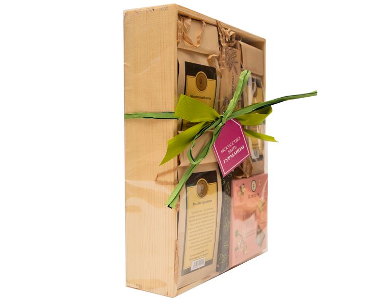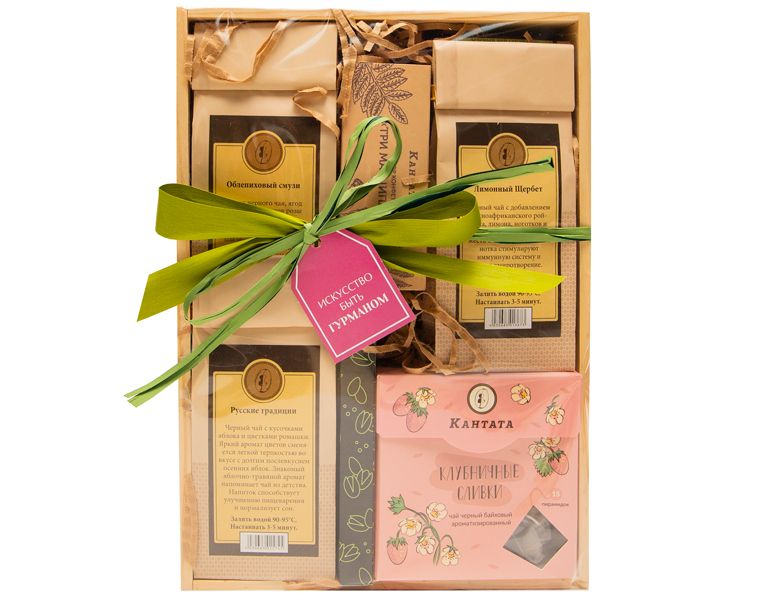 Этот подарок для истинных гурманов! Мы приглашаем вас окунуться в особенный мир разных стран. Вас встретят традиционные составляющие русских напитков: яблоко и ромашка в чёрном чае «Русские традиции», согревающий лимон в сочетании со сладкой ванилью — в «Лимонном щербете». Тропические оттенки ярко отобразятся в пакетированном чае «Клубничные сливки» и чае «Облепиховый смузи». Три вкуса марципана перенесут вас в европейские столицы. Завершат путешествие восточные оттенки Шокобара с фисташкой.
