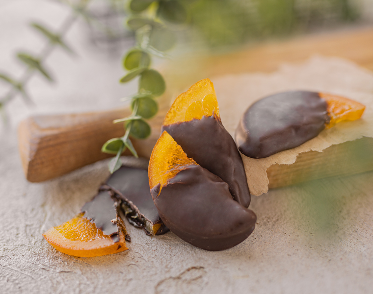 Каждая сочная апельсиновая долька покрыта на две трети густым слоем темного шоколада, в котором содержание какао-продуктов достигает 60%. Благодаря содержащемуся кофеину, горький шоколад поможет взбодриться, стимулируя умственную и физическую деятельность.
