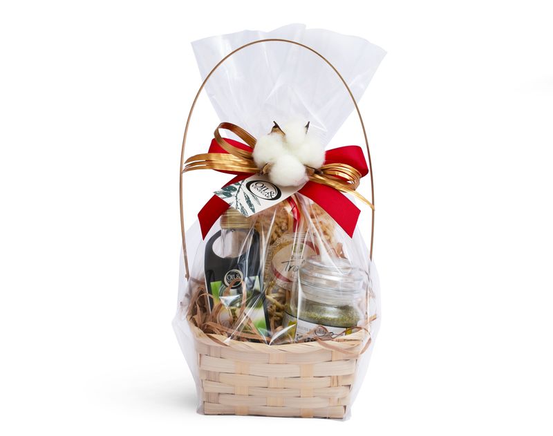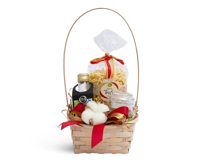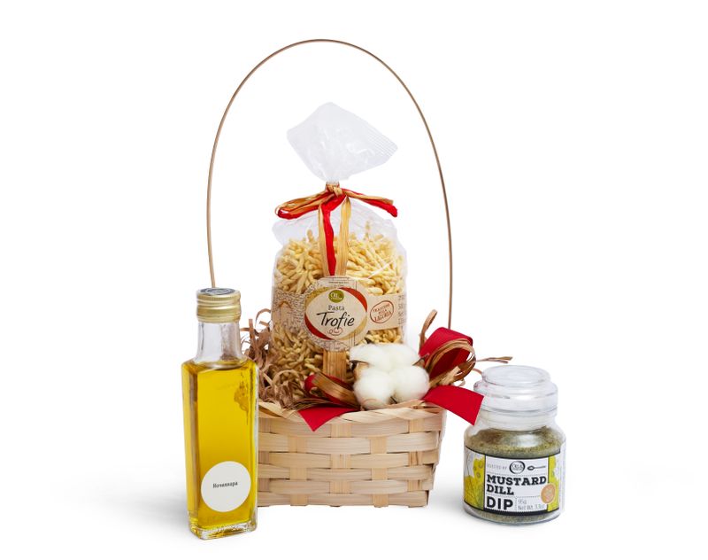 Изящная корзина, полная непревзойденных вкусов! В подарке – паста Трофие в качестве гарнира, душистая смесь с горчицей и укропом и нежное оливковое масло «Ночеллара».
