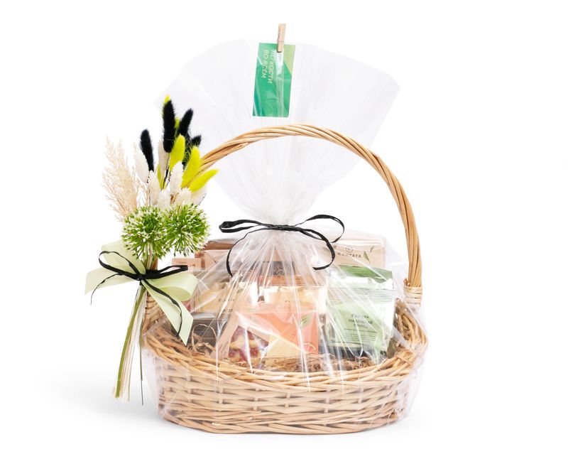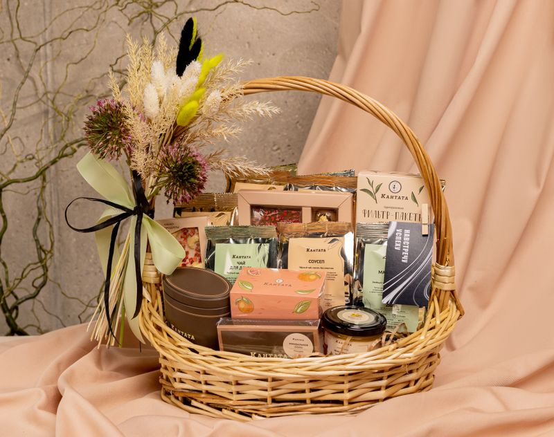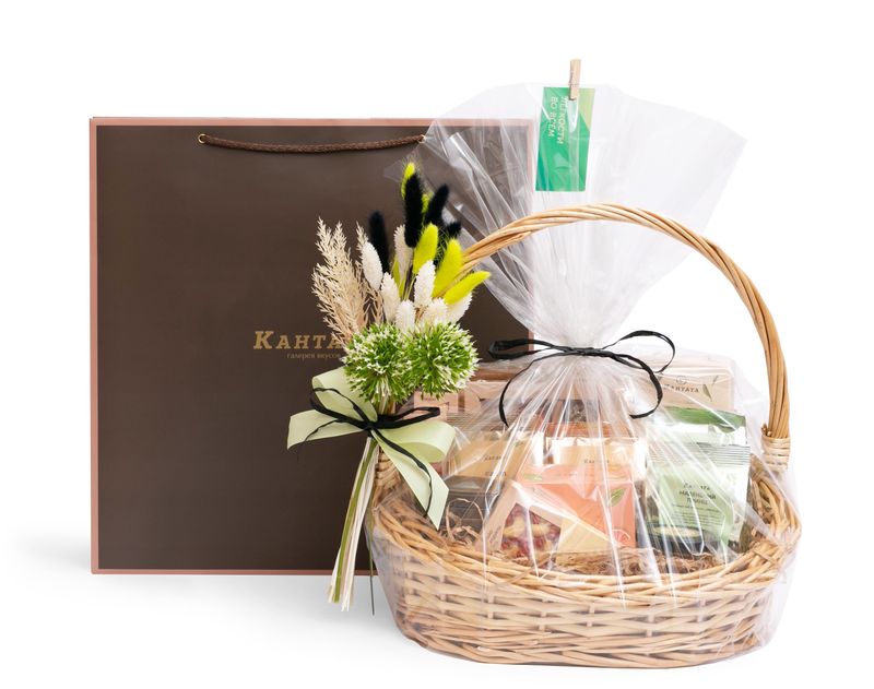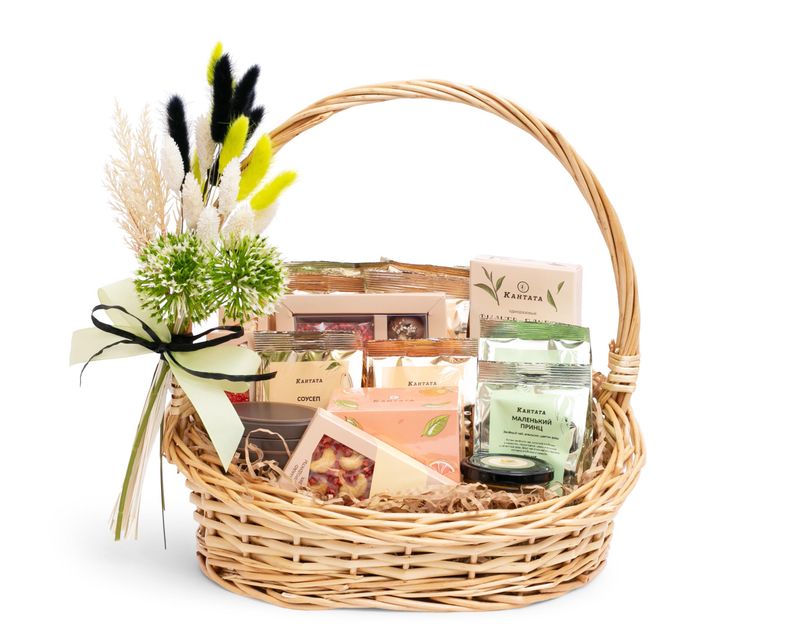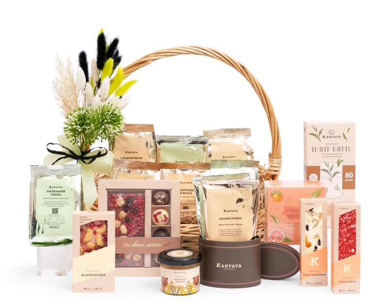 Подарок, который не оставит равнодушным даже самого искушенного чайного гурмана! В корзине мы объединили 9 душистых сортов чая — как классических видов, так и купажей, а к ним добавили стильную баночку для хранения с логотипом Кантаты. Чтобы каждое чаепитие проходило с комфортом, поместили в подарок удобные фильтр-пакеты для заваривания. К напиткам на десерт в корзине найдется широкая линейка сладостей ручной работы — нуга «Микс здоровья» и «Сила Тайги», набор шоколада с конфетами «Классика», плитка белого шоколада с ягодами и орехами «Клубничка», а также баночка воздушного крем-меда с согревающим вкусом имбиря.