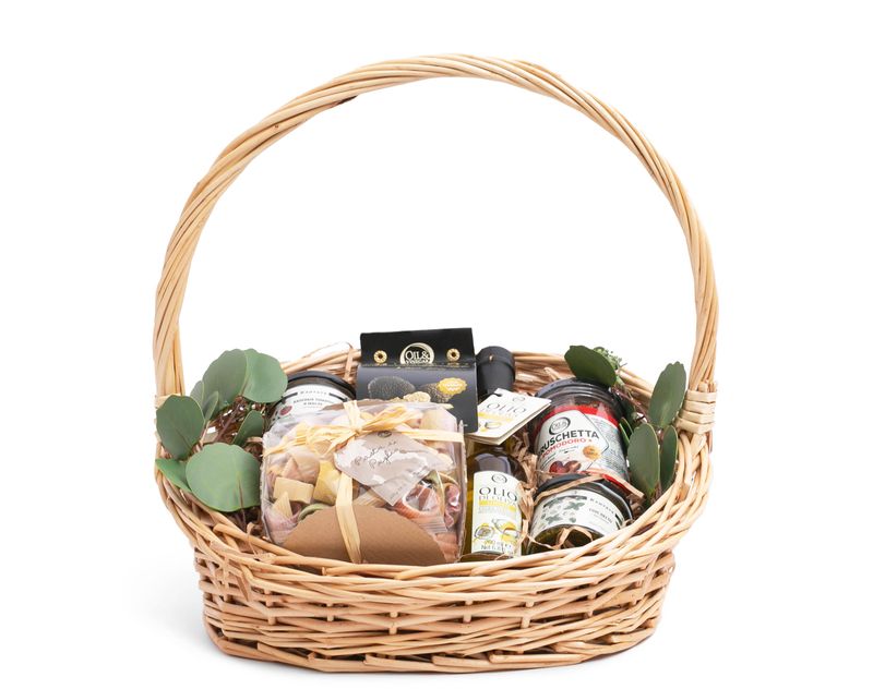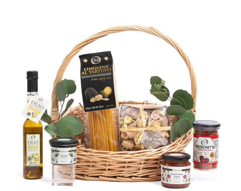 Сделайте любимому гурману приятный сюрприз на праздник! В подарок мы вложили изысканные пасты «Апулия» и «Лингуине» с чернилами каракатицы, а к ним — душистое оливковое масло с лимоном, соус песто с фисташкой и универсальную брускетту с помидором, а также аппетитную закуску — вяленые томаты с розмарином в масле.