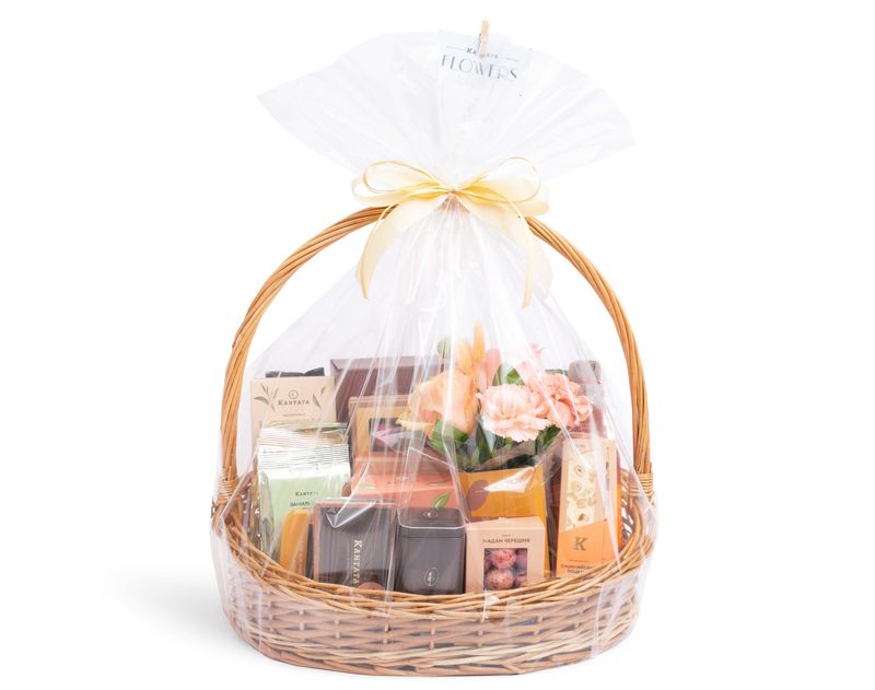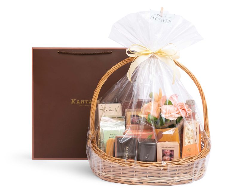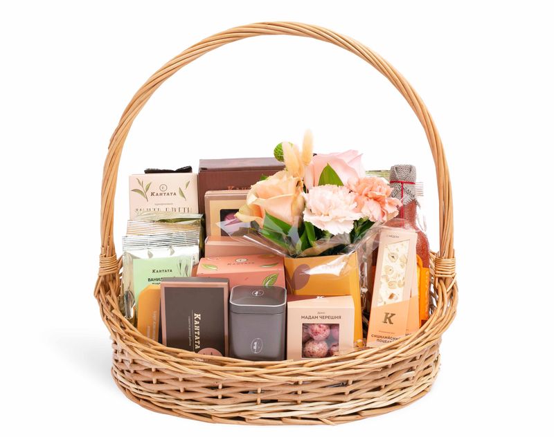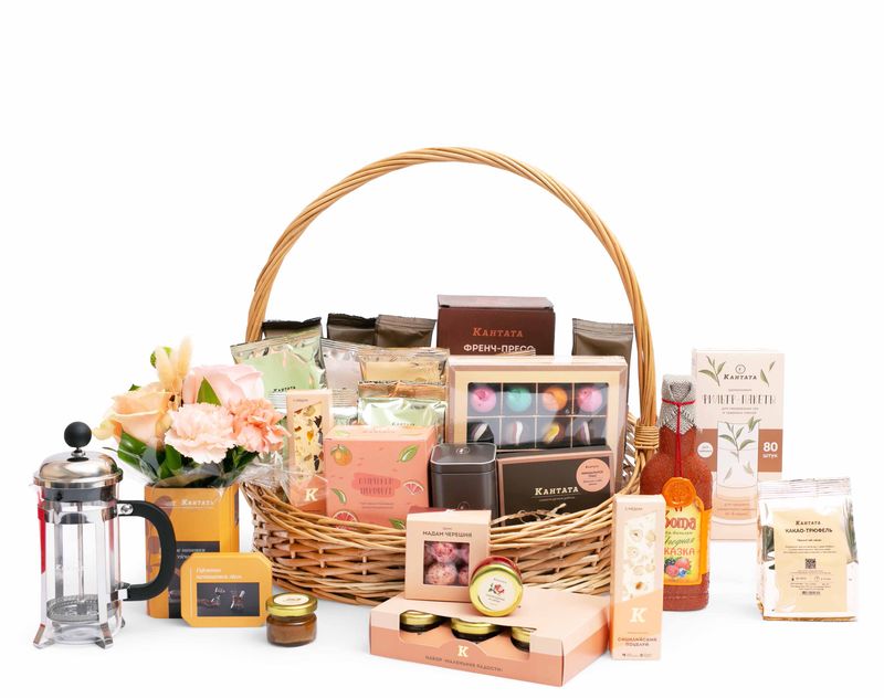 Энергия и релакс, чай и кофе — все это про нашу корзину, которую мы украсили ароматными живыми цветами. В подарке дорогой вам человек найдёт восемь видов чая и четыре сорта кофе, среди которых найдутся как классические, так и десертные напитки на любой вкус. К ним мы добавили незаменимые аксессуары — стильный френч-пресс, дизайнерскую баночку для хранения «Гармония внутри» и удобные фильтр-пакеты для заваривания. На десерт в подарке — целая коллекция вкусов, среди которой есть такие жемчужины ассортимента Кантаты, как набор марципанов в шоколаде, шестнадцать конфет ручной работы, мед-бальзам с душистыми ягодами, «Маленькие радости» из шести баночек с различными десертами, аппетитные вишнёвые драже и две сытные сладкие нуги.