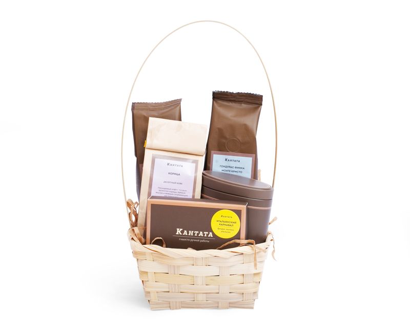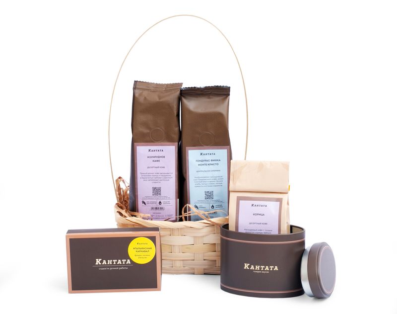 Стильный подарок для любителя кофе! В корзину мы вложили десертные сорта «Корица» и «Изумрудное кафе» с пряными вкусами, а также классический сорт «Гондурас Финка Монте Кристо» с аппетитными нотами ржаного хлеба. Дополнили подарок стильной баночкой для хранения, а на десерт вложили набор джандуй в шоколаде.
