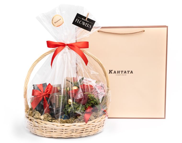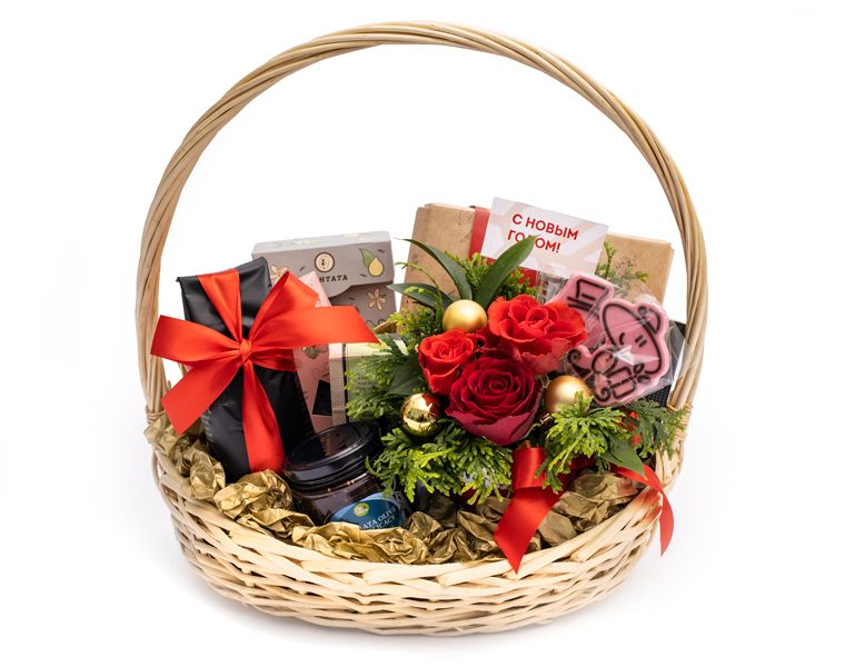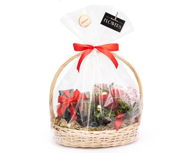Сочетаем в этой корзине цветочную композицию из живых ярко-красных роз и вечнозелёных растений, аксессуары для вкусных зимних напитков, потрясающие сладости, деликатесы, чай и кофе.