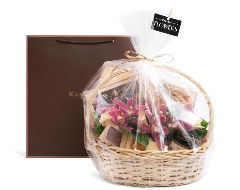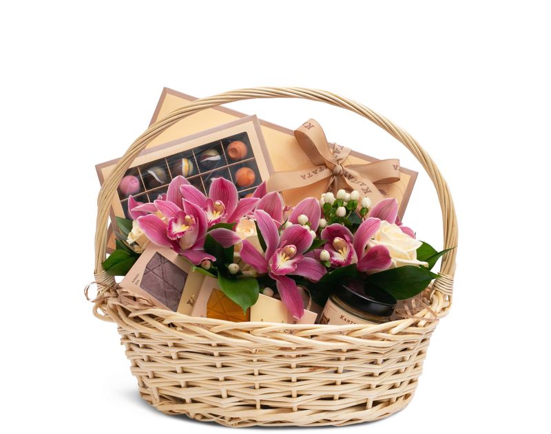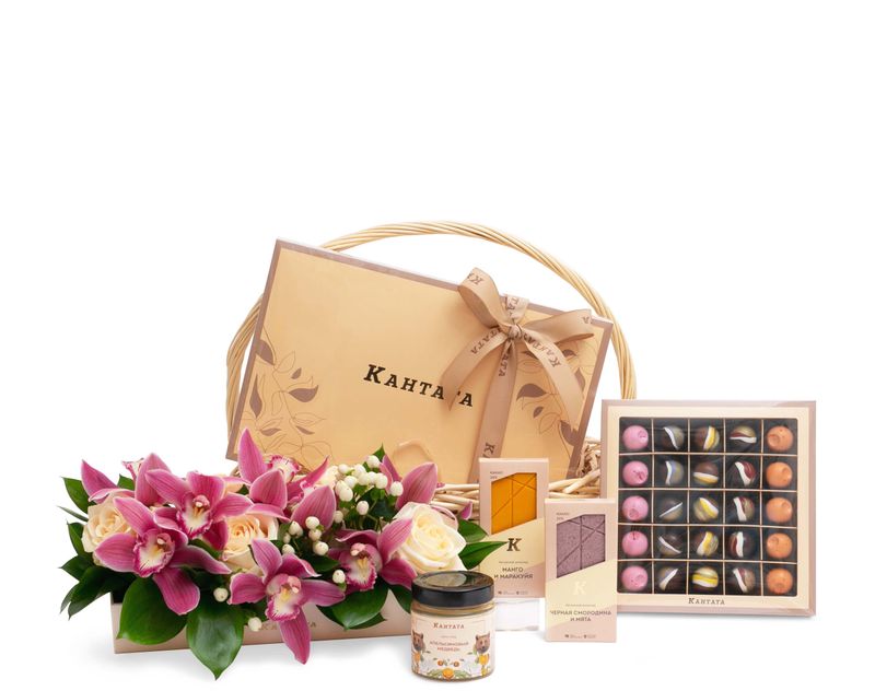 Праздник пройдет великолепно вместе с подарком, украшенным нежной цветочной композицией и составленным из аппетитных десертов высшего качества — 25-ти конфет ручной работы, авторского шоколада двух видов, апельсинового крем-мёда и набора из трех мягких десертов в баночках.