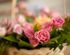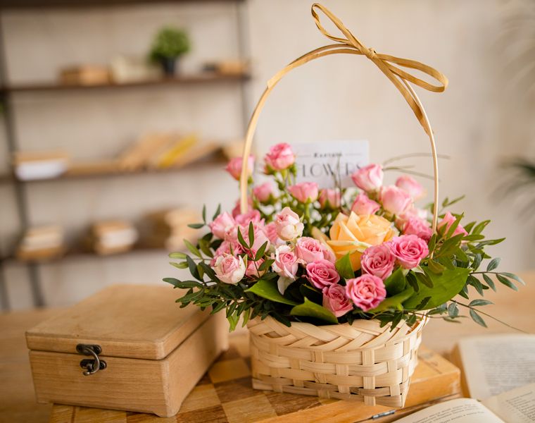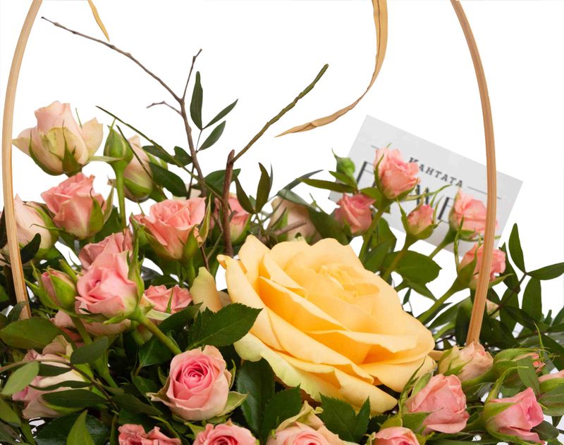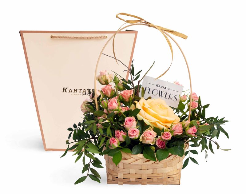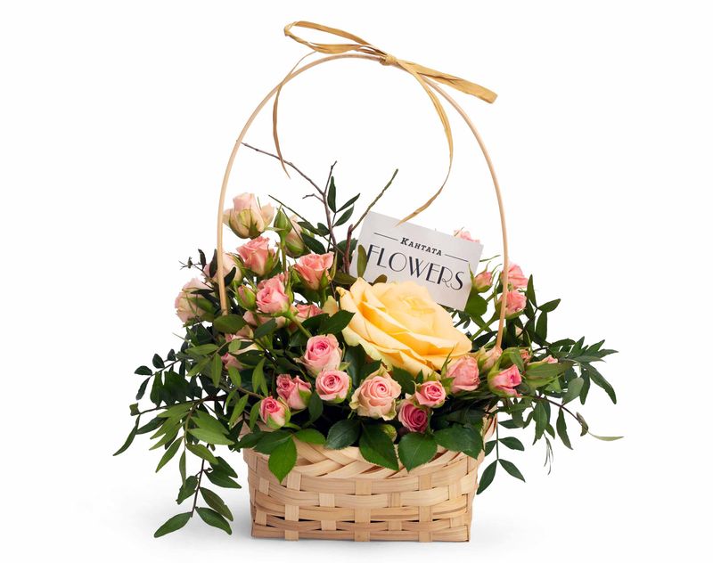 В изящной корзине – нежные живые розы, дополненные веточками фисташки.