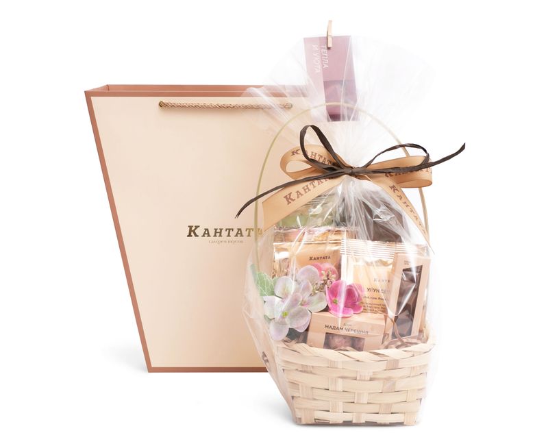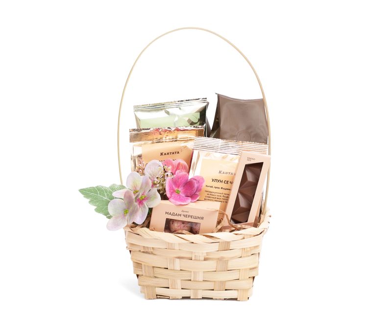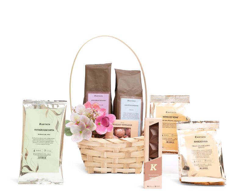 Чай и кофе для дорогого человека! В изящной корзине найдутся три ароматных сорта чая и два бодрящих вида кофе в зернах. Нежные драже из белого и молочного шоколада «Мадам Черешня» и шокобар «Нежные облака» дополнят любимые напитки аппетитной десертной нотой.