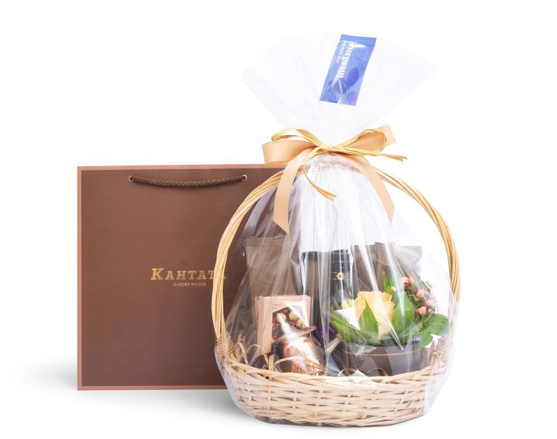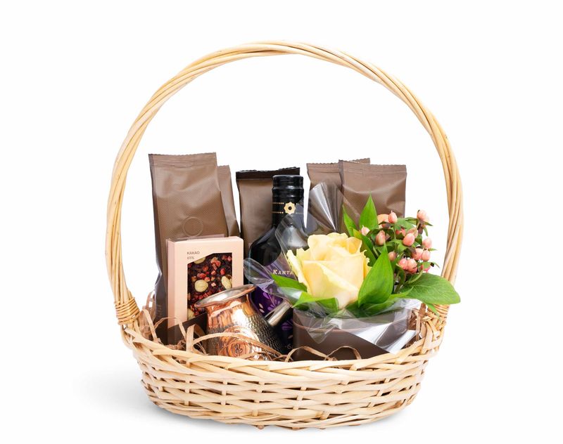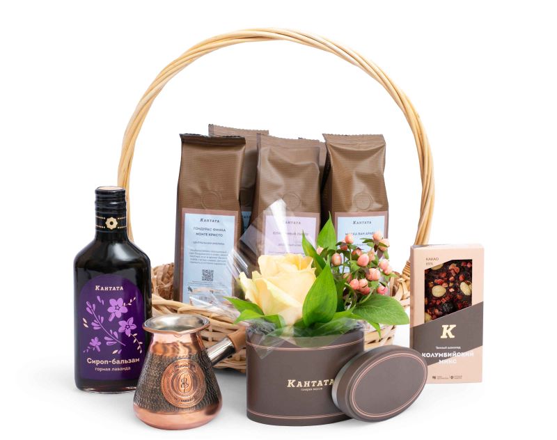 Аромат кофе в сочетании с душистыми живыми цветами… Что может быть приятнее? Этот подарок украшают живые розы в обрамлении листочков рускуса, а в самой корзине – пять видов кофе высшего качества, среди которых представлены как классические, так и десертные сорта. Для хранения зерна в наборе найдется стильная баночка, а чтобы напитки всегда получались идеально вкусными, в подарок мы добавили медную турку с логотипом «Кантаты». На десерт – плитка темного шоколада с орехами и ягодами и бальзам «Горная лаванда», который украсит своей ароматной сладостью любимый напиток или выпечку.