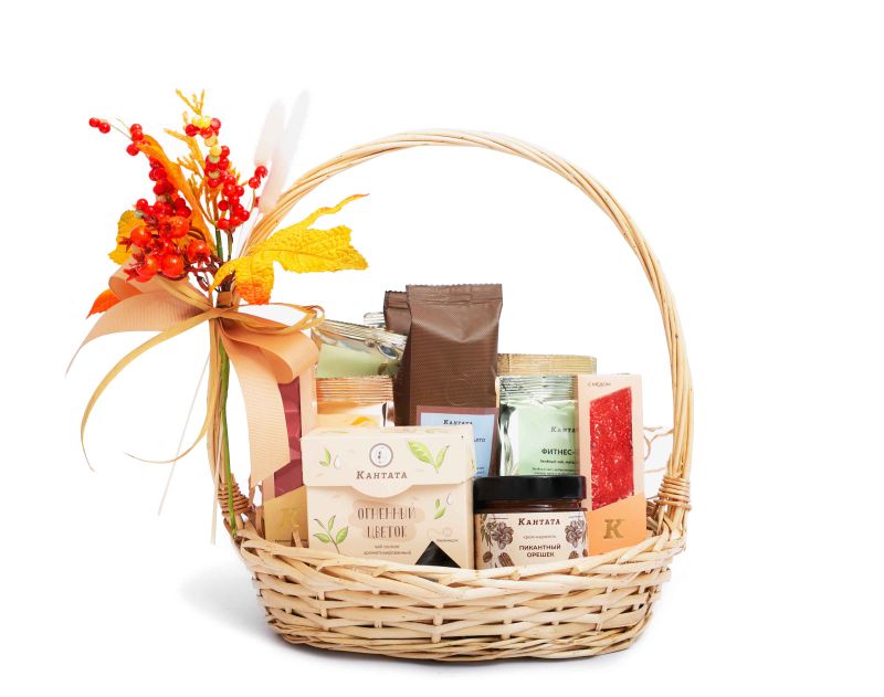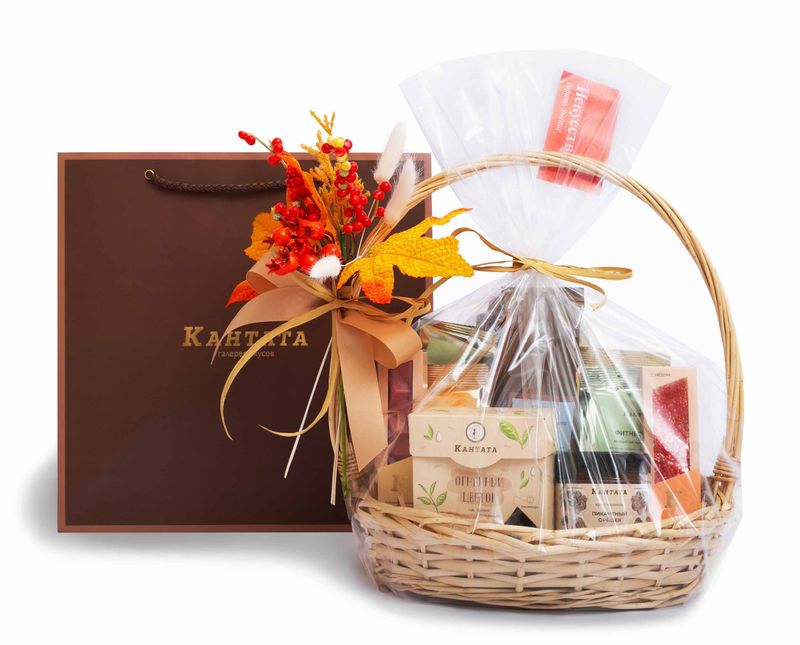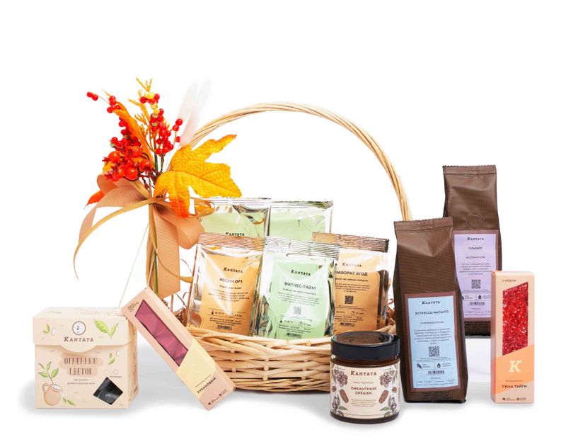 Этот многогранный подарок мы украсили огненной рябиной с кленовыми листьями. В корзине – шесть видов чая на любой вкус, классические сорта и десертные купажи, которые всегда согреют своим теплом и окутают чувством уюта. К ним – два сорта кофе. Это классический купаж арабики «Эспрессо Масалто» с нежным вкусом молочного шоколада, сливок и горячего хлеба, а также десертный кофе «Сникерс» с восхитительным сочетанием арахиса, нуги, сливочной карамели и молочного шоколада в послевкусии. На десерт – плитка редкого рубинового шоколада, крем-карамель «Пикантный орешек» с грецким орехом и пеканом, а еще – сладкая и сытная нуга «Сила Тайги».